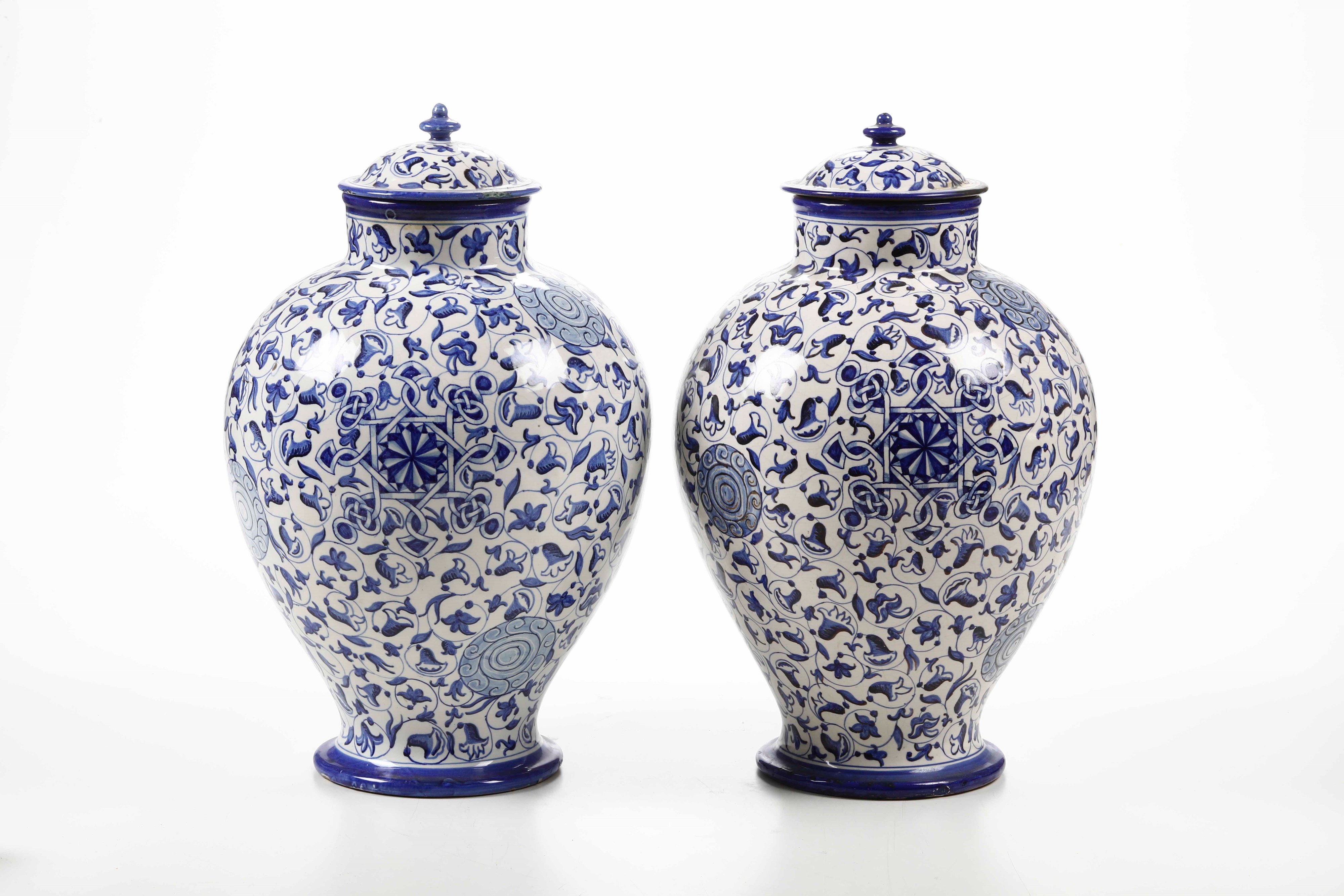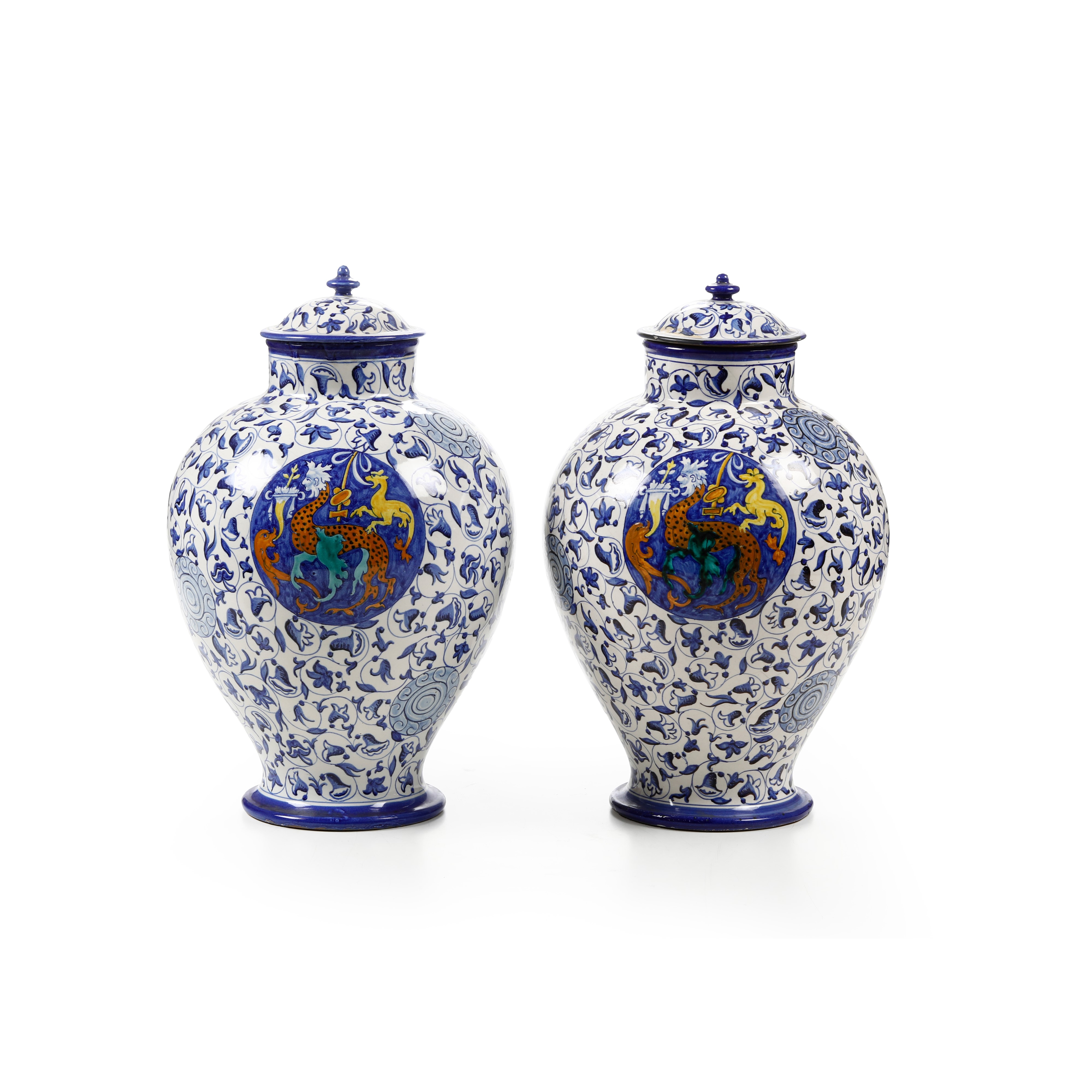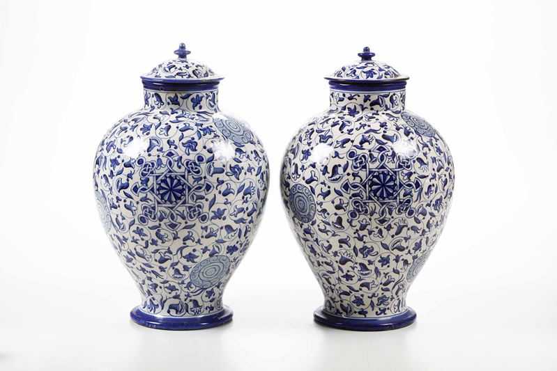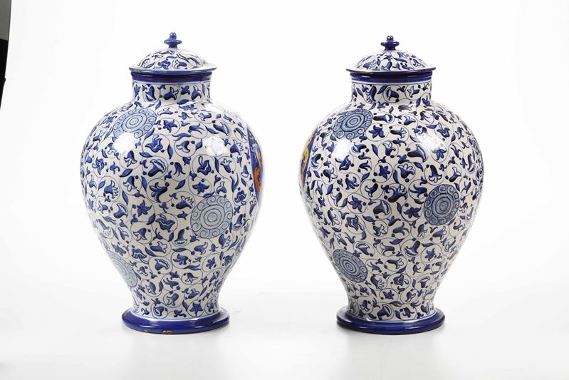 Maiolica policroma a gran fuoco. Marca in nero. Altezza cm 40. Conservazione: buona; un vaso con insignificanti felature di smalto; coperchi con rotture restaurate.