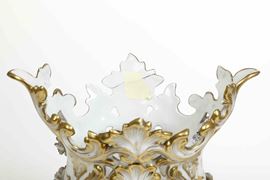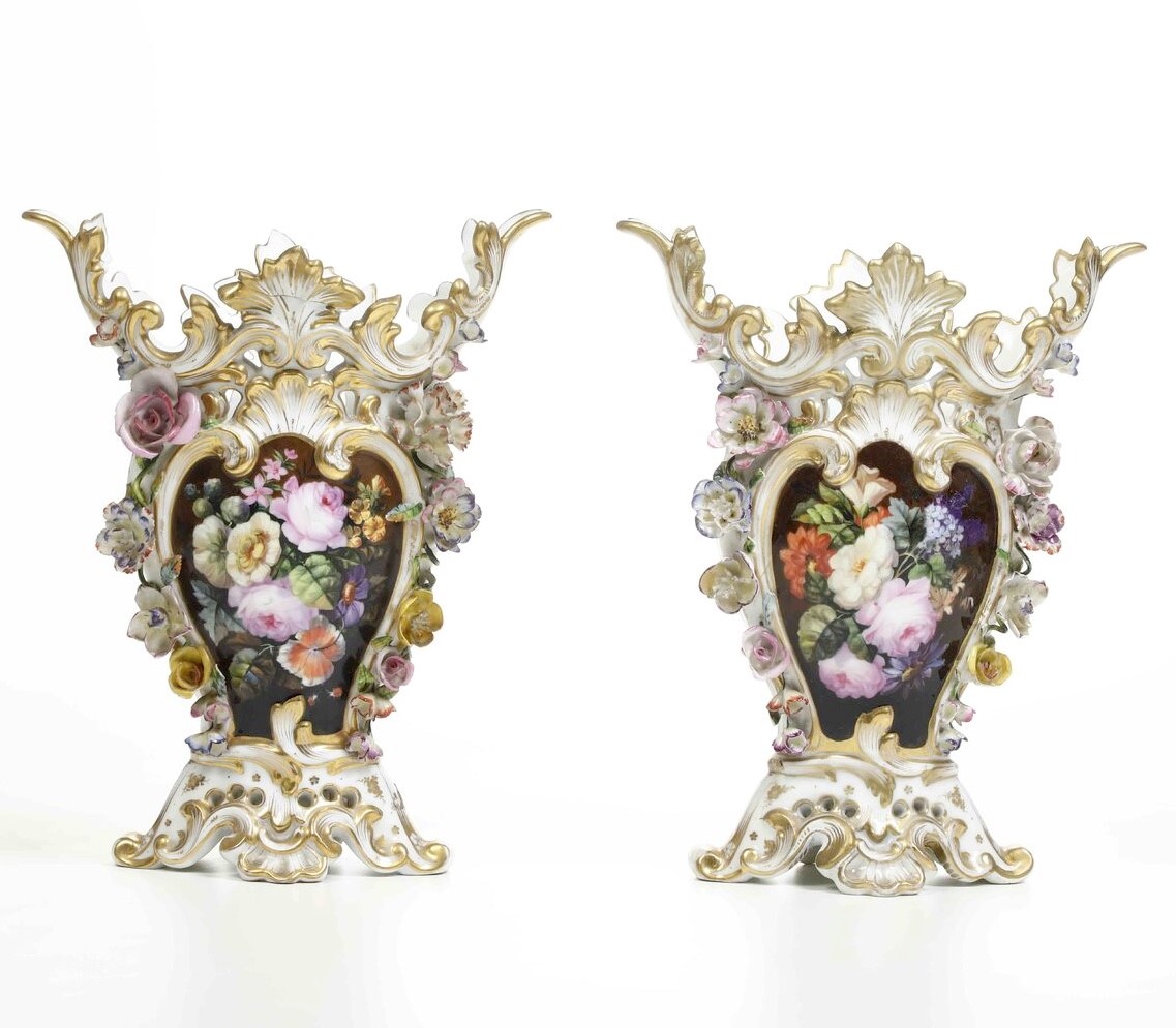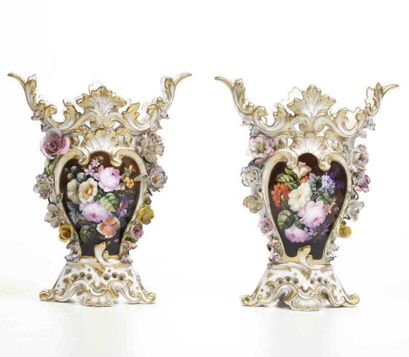 Porcellana. Marca: assente. Altezza cm 26 circa. Conservazione: un vaso con una foglia del borPorcellana. Marca: assente. Altezza cm 26 circa. Conservazione: un vaso con una foglia del bordo superiore staccata da incollare; l'altro vaso ricomposto in restauro; mancanze minori alla vegetazione.do superiore staccata da incollare; l'altro vaso ricomposto in restauro; mancanze minori alla vegetazione.