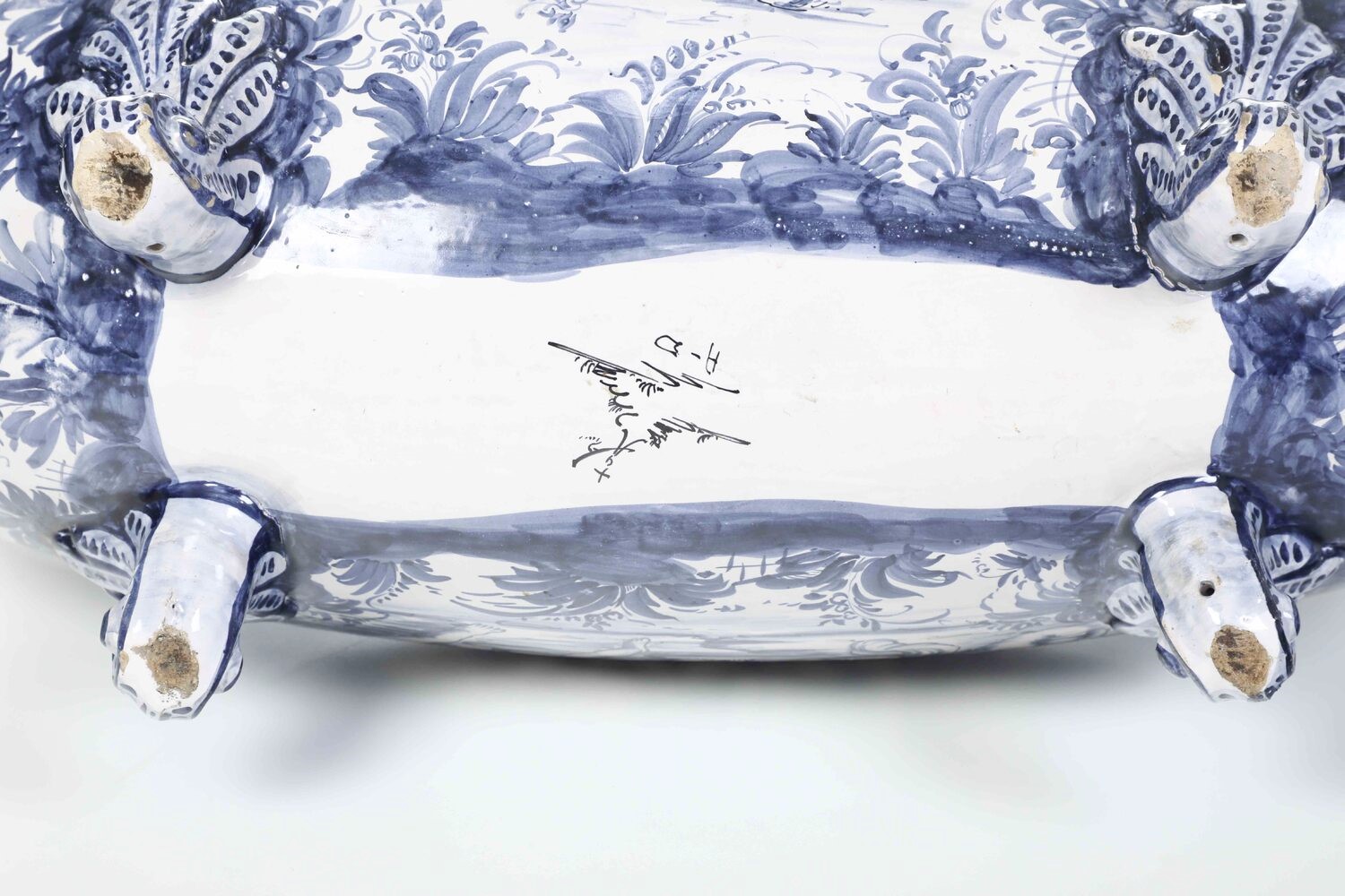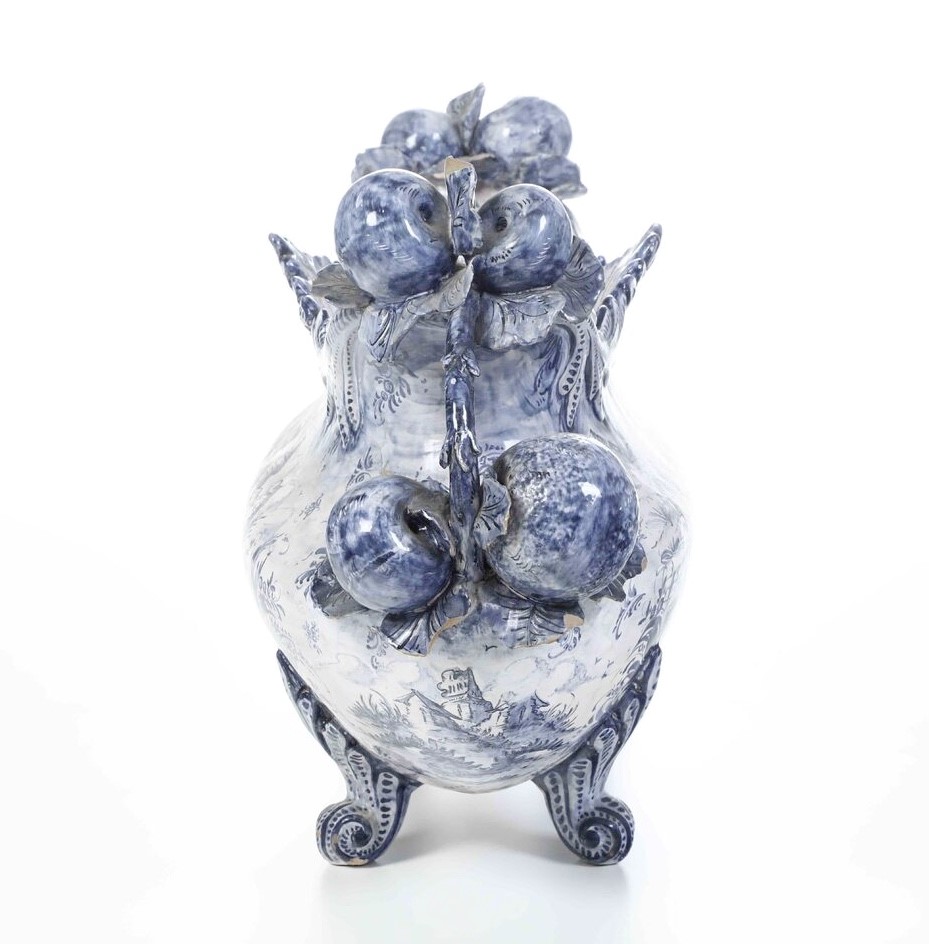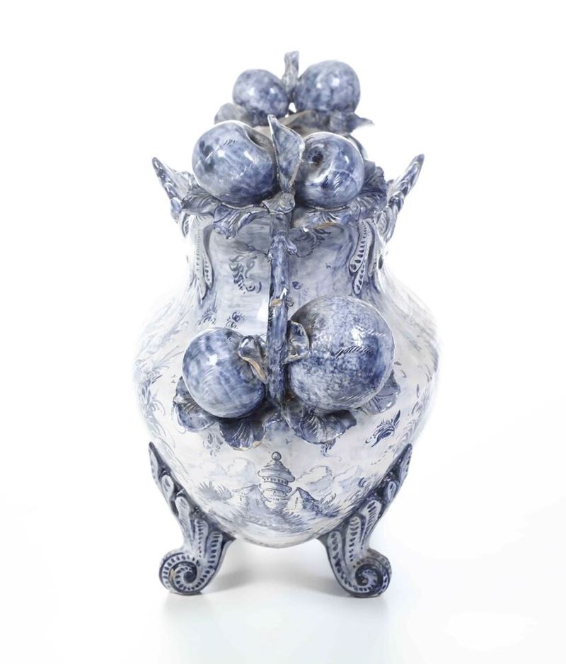 Maiolica. Marca: lanterna con "AD". Dimensioni: altezza cm 38; cm 67x24. Conservazione: buona; piccole mancanze alle foglie e insignificanti sbeccature.