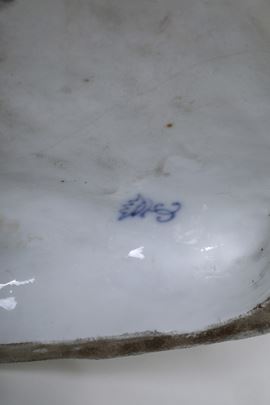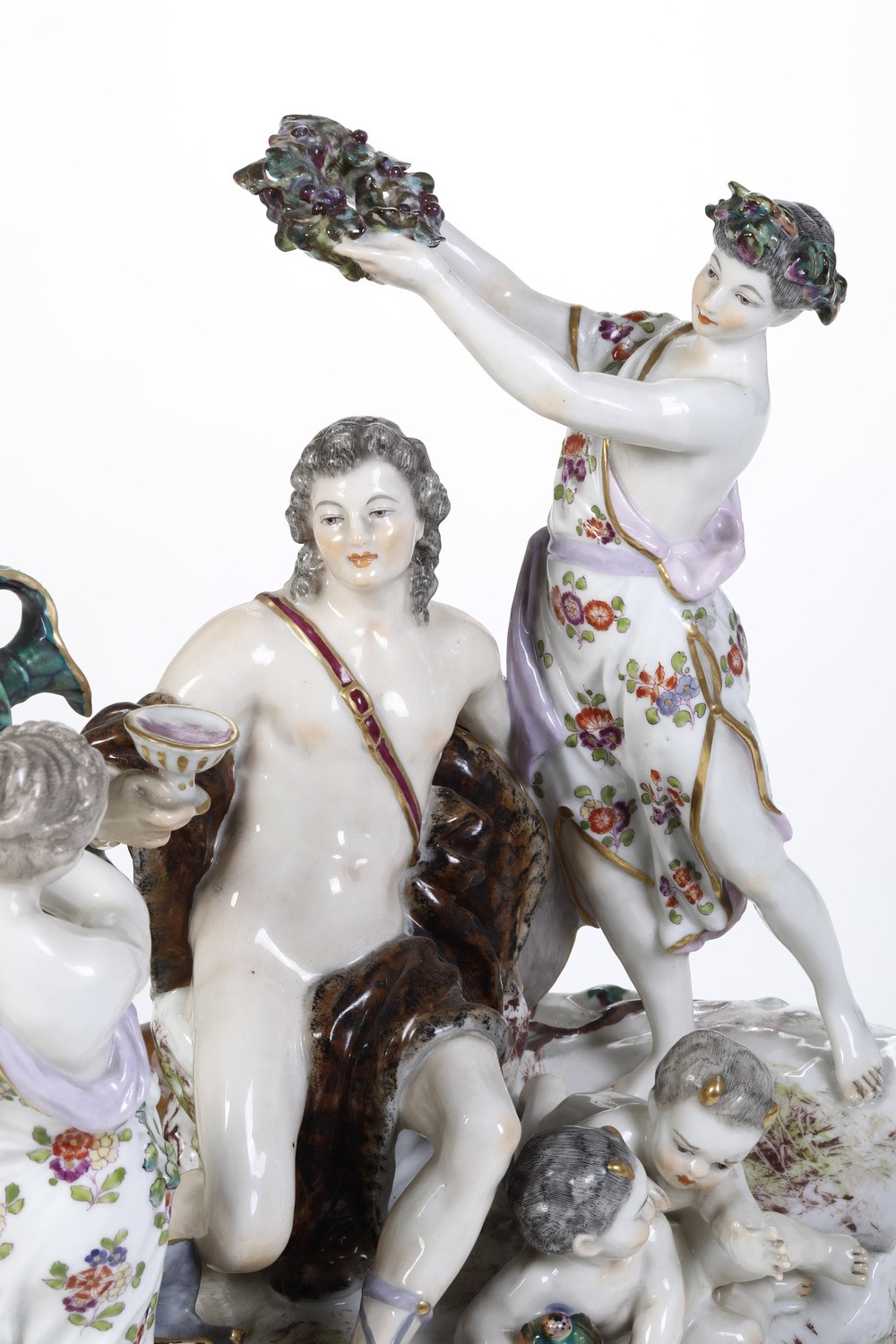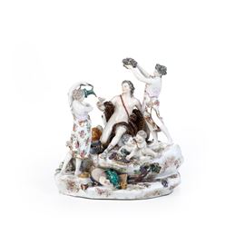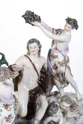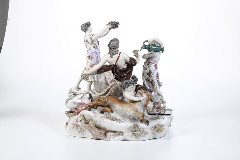 Porcellana. Marca: "CT" con corona in blu; pseudo marca di Frankenthal. Altezza cm 36. Conservazione: ottima; un braccio di un putto incollato; mancanze minori al tirso di Bacco e alla tromba
