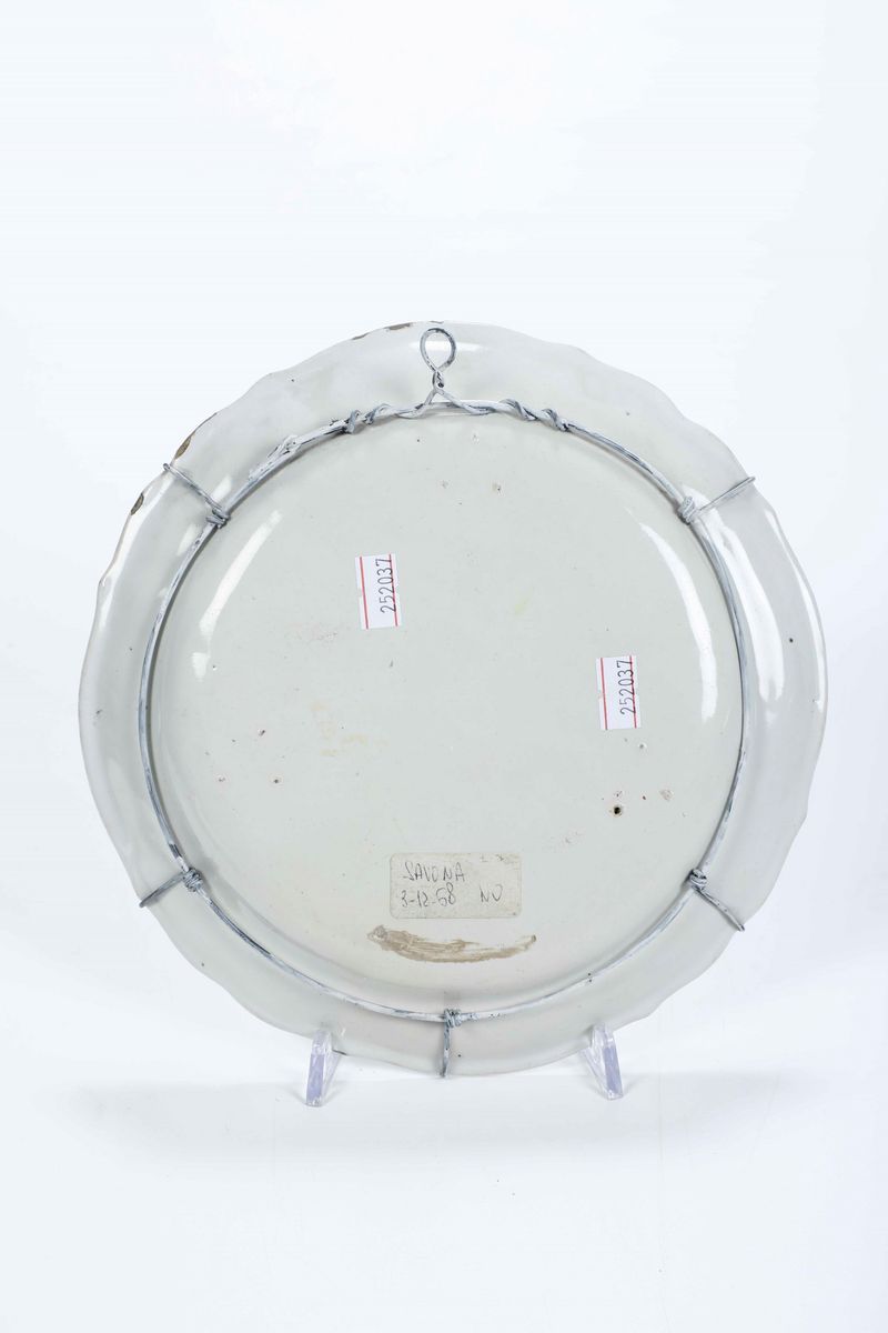 Maiolica decorata a gran fuoco in monocromia ocra. Marca assente. Diametro cm 22,5. Conservazione: ottima; leggera felatura allo smalto qualche minima sbeccatura al bordo.
