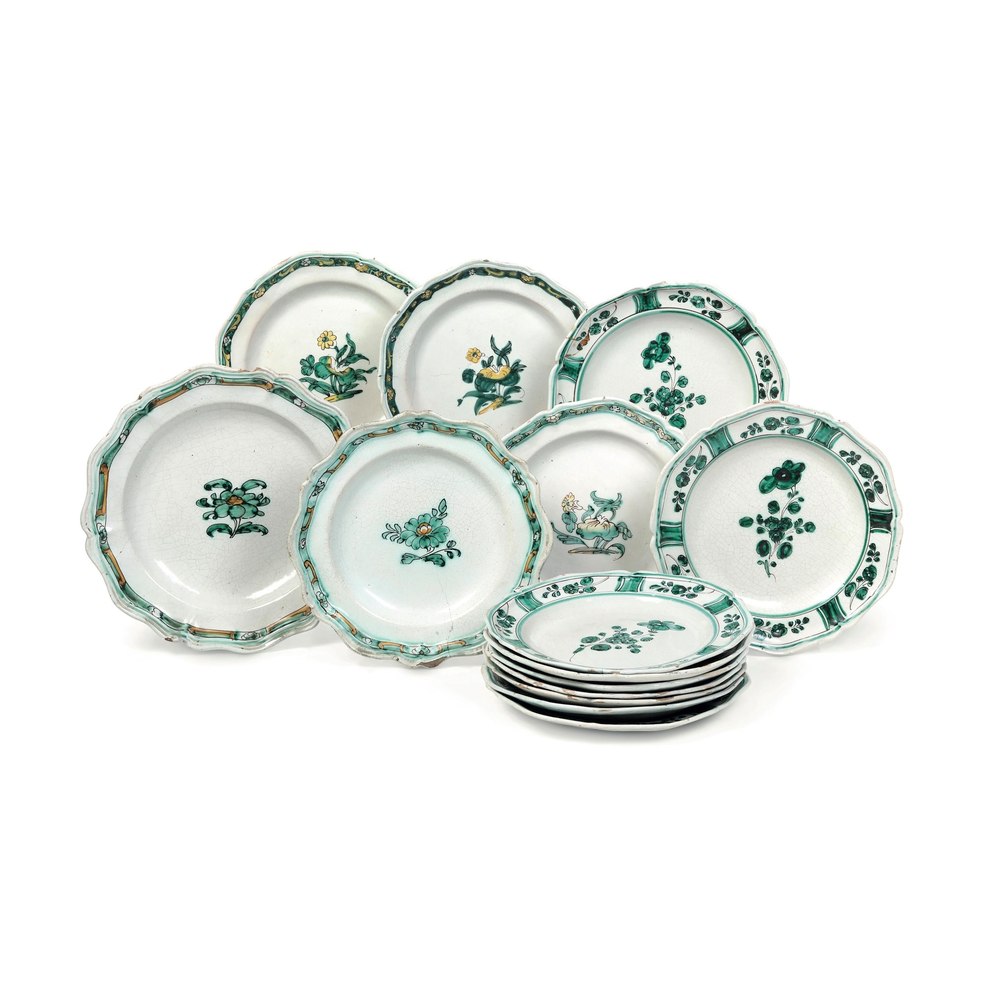 Maiolica decorata a gran fuoco. Marca: assente. Diametro cm 27,5; cm 23,5 circa. Conservazione: 5 piatti in buono stato con insignificanti sbeccature al bordo; gli altri con felature e sbeccature.