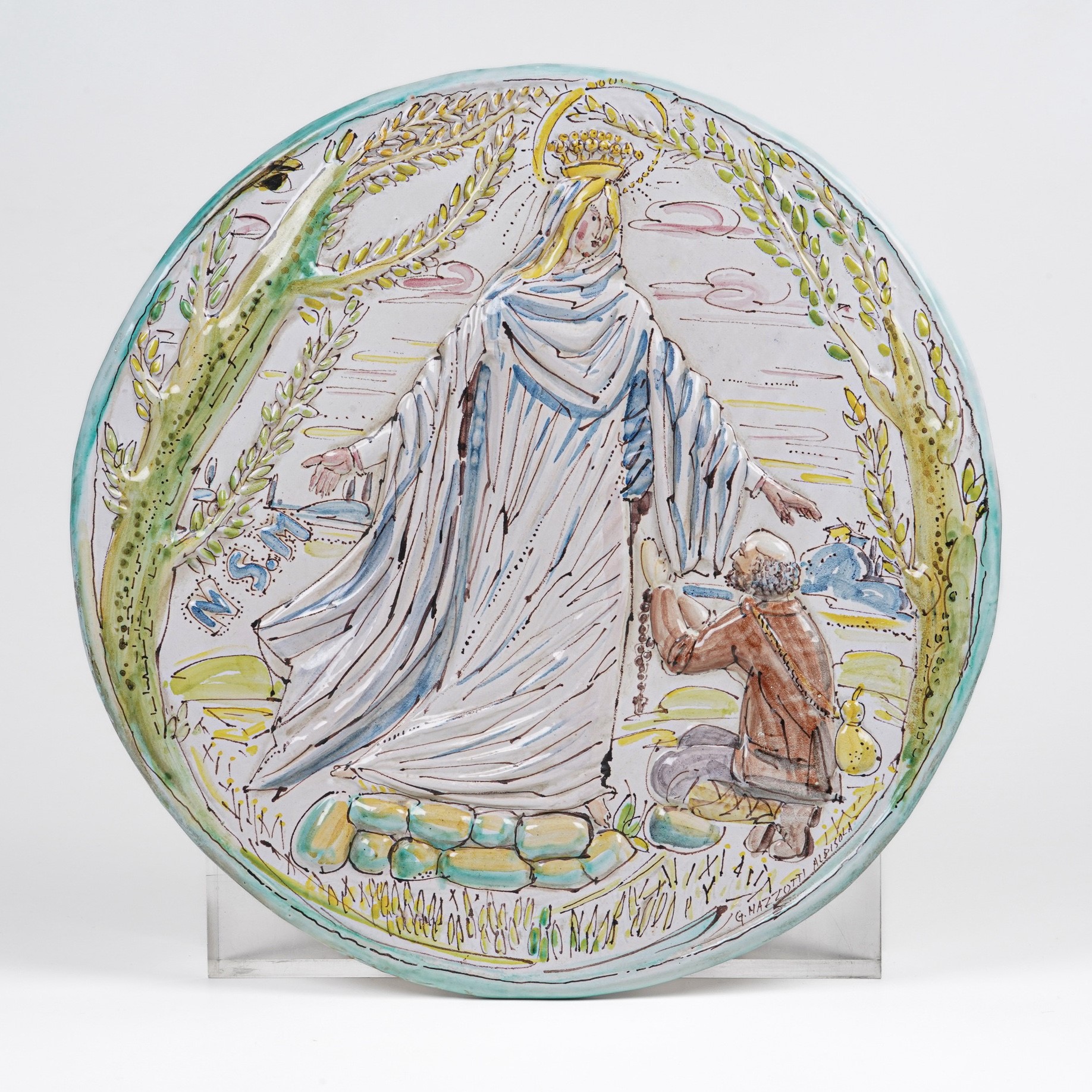 Targa a rilievo basso con vergine e Beato Botta. Albisola, Manifattura Giuseppe Mazzotti, XX secolo.