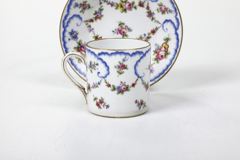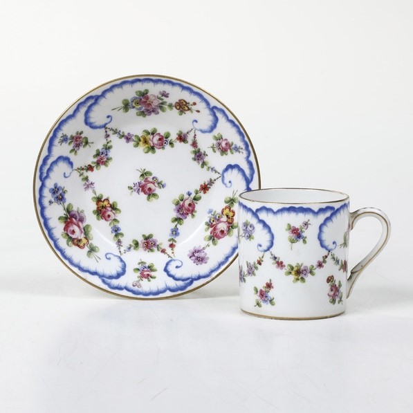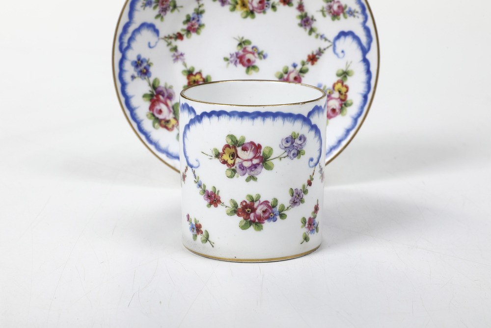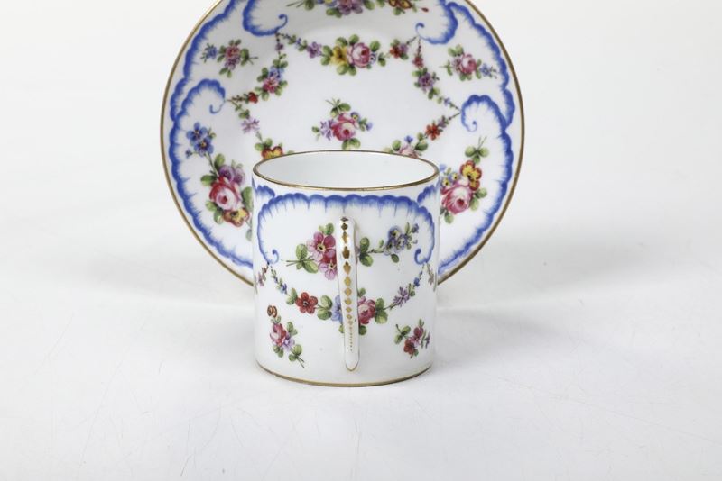 Tazza cilindrica con piattino troncoconico dalla decorazione policroma di ghirlande di fiori e motivi a “Feuiles de choux”, ossia foglie di cavolo esaltati da linee pettinate in blu, profilature in oro.