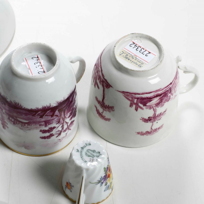 Tre differenti tazze e sei differenti piattini. XVIII e XX secolo.