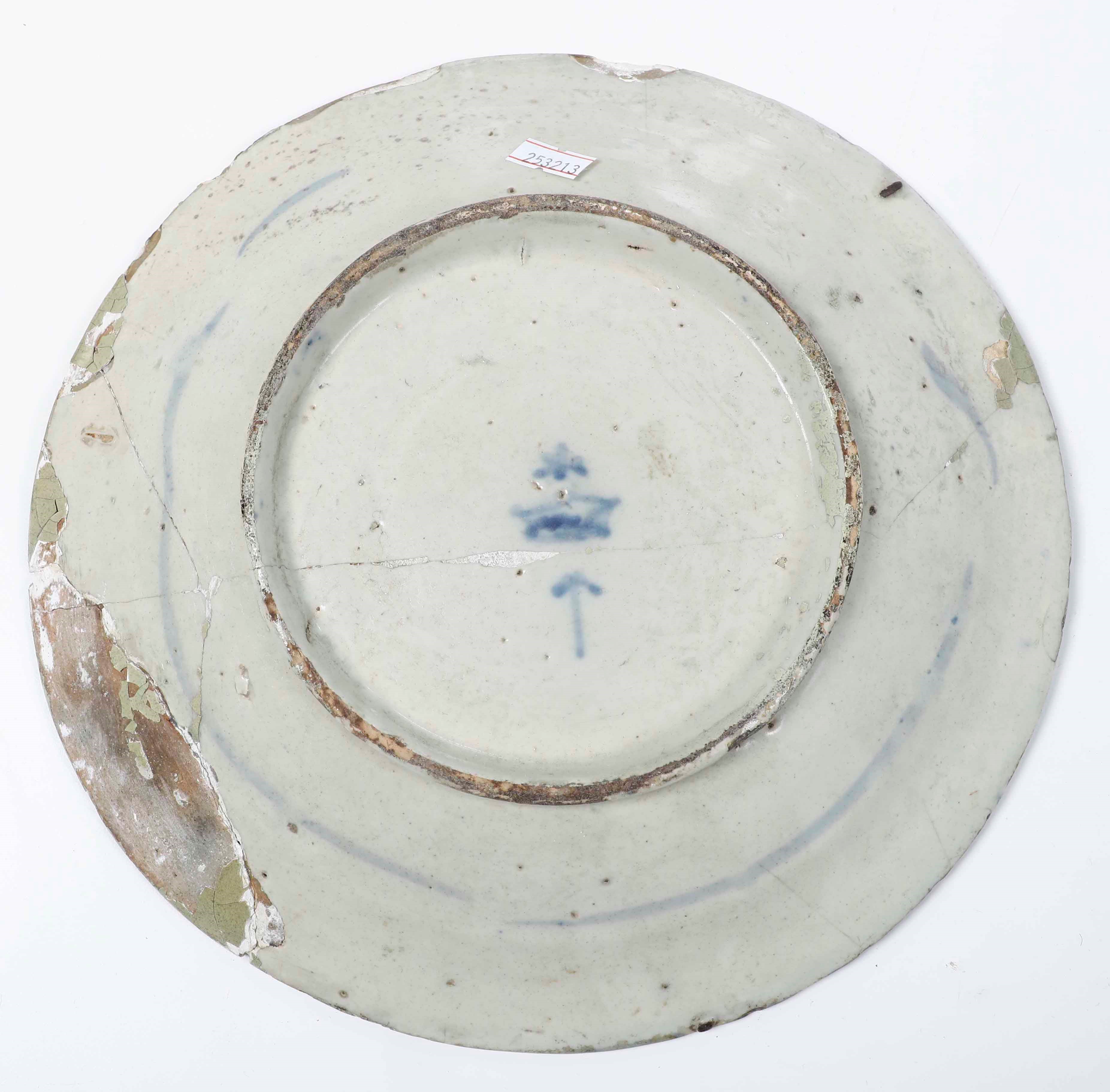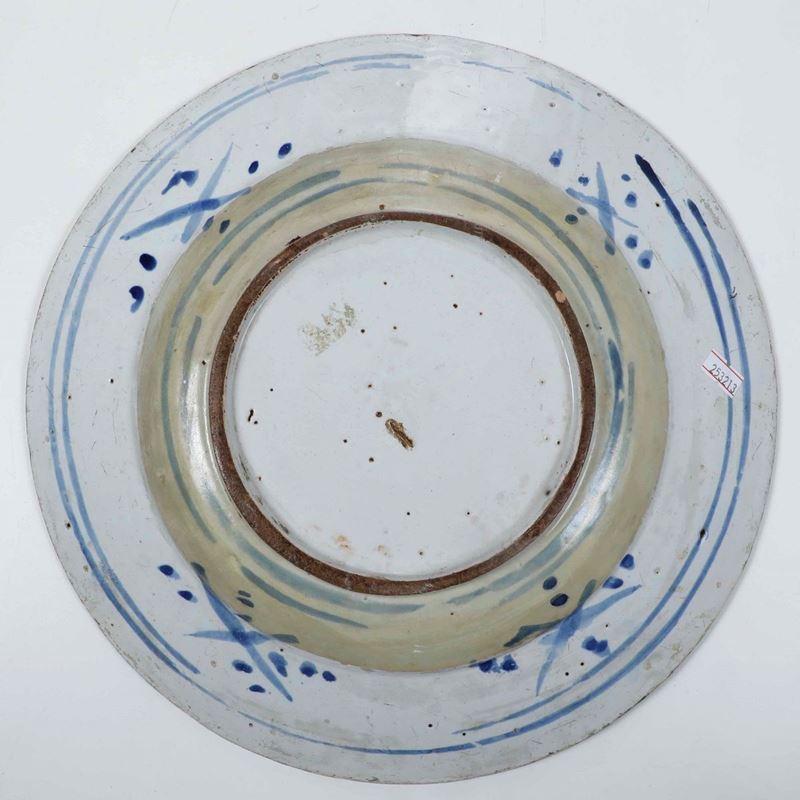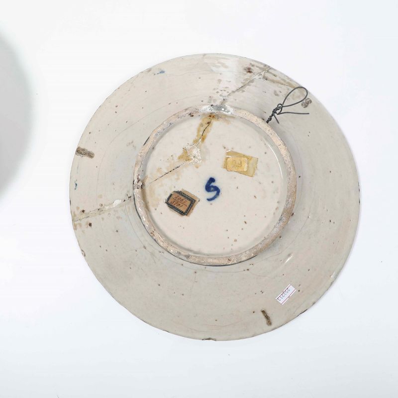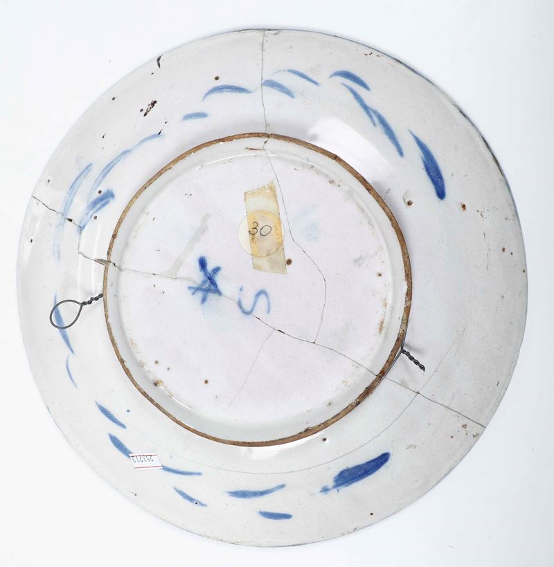 Maiolica decorata in monocromia blu. Marche diverse. Diametro massimo cm 33,5. Conservazione: restauri e felature.