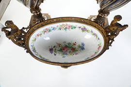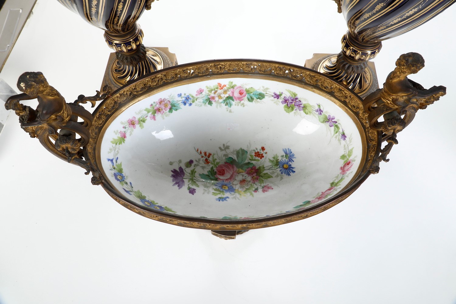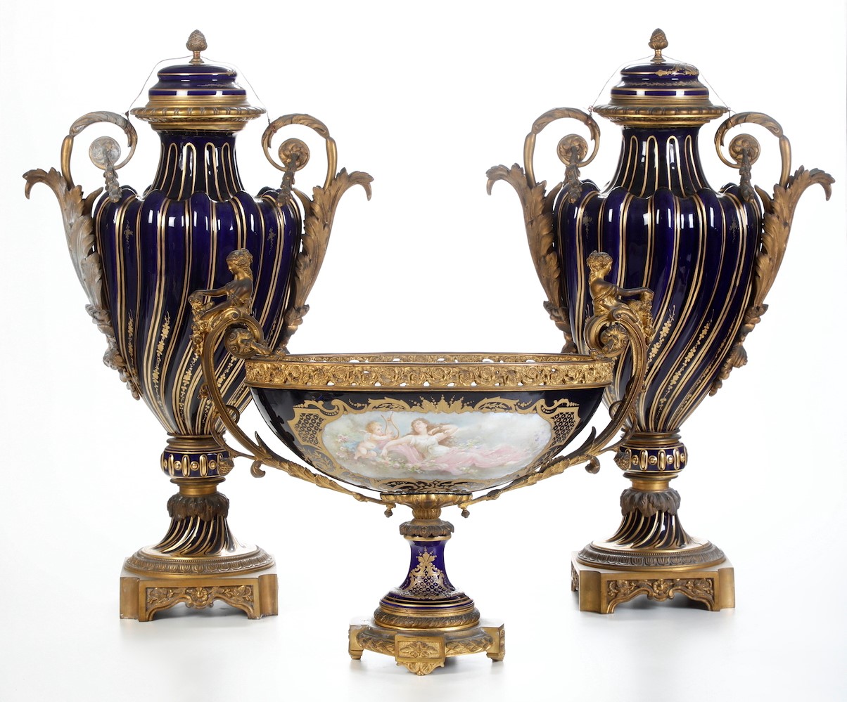 Porcellana a fondo blu e decorata in oro. Marca: marche apocrife per Sèvres. Dimensioni: Vasi, altezza cm 64. Centrotavola, altezza cm 40,5;47,5x24,2. Conservazione: ottima; un vaso con rottura a un piede