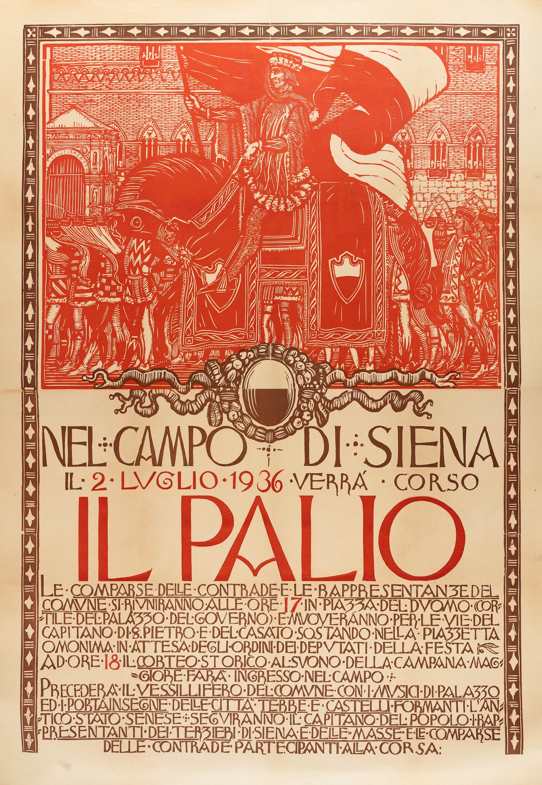 Affisso litografico, 1936. Impresso da Officina Grafica - Siena. Cm 142 x 101. Telato. Qualità A/B.
