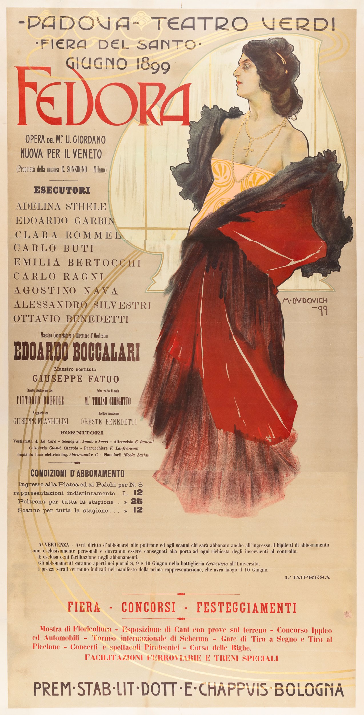 Affisso litografico, 1899. Impresso da Prem. Stab. Lit. Dott. E. Chappuis - Bologna. Cm 205 x 106,5. Telato. Qualità A/B