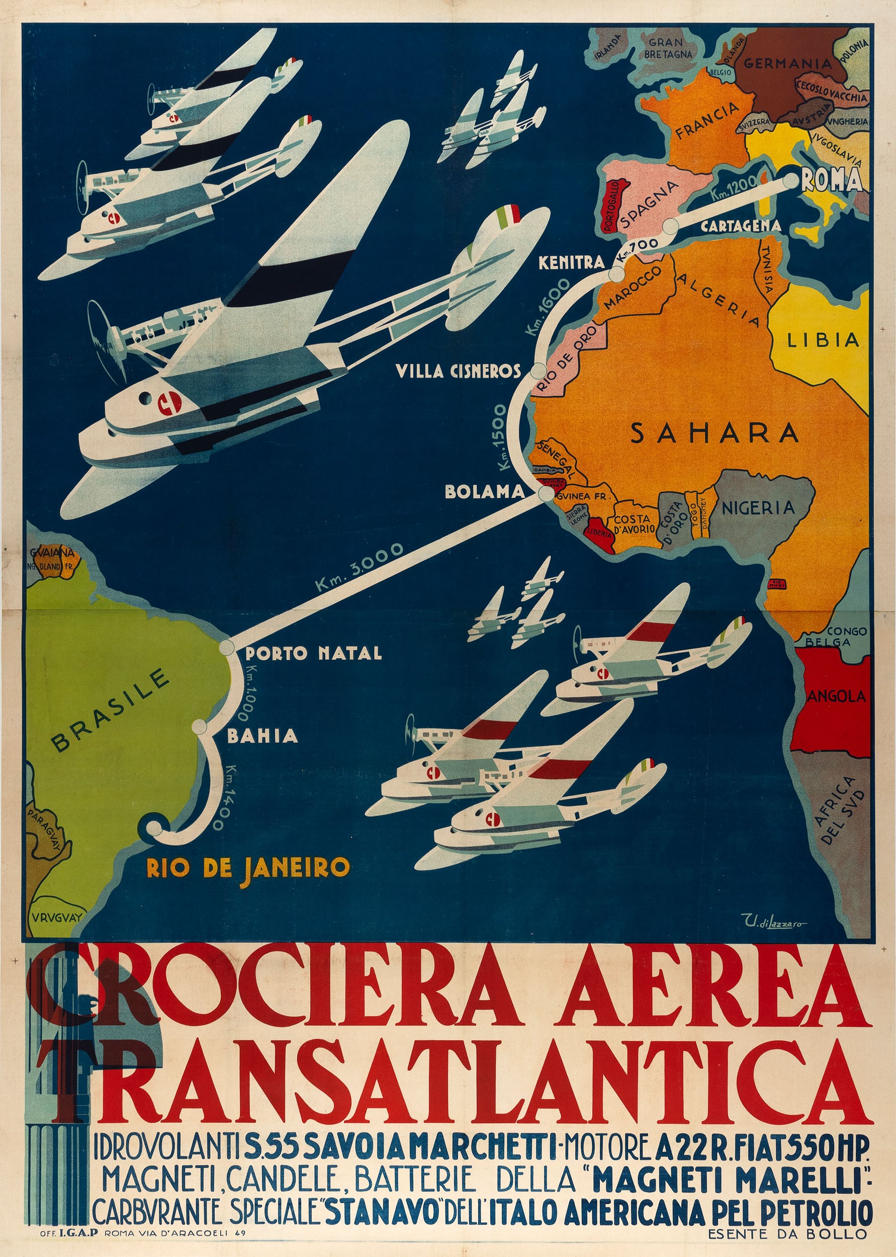 Affisso litografico, 1930. Impresso da Off. Graf. I.G.A.P. - Roma. Cm 200 x 140. Telato. Qualità A/B.