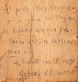 Sul retro in legno scritta autografa di Gabriele D'Annunzio a Padre Bevilacqua datata 1927