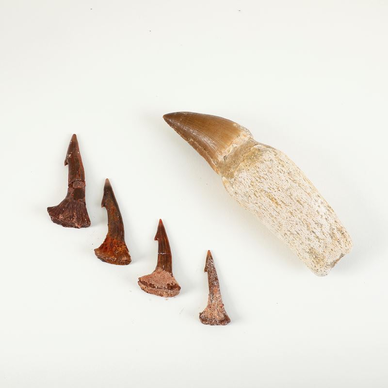 Lotto composto da dente di Mosasauro (circa 70-65 milioni di anni fa - Maastrichtiano) con radice e quattro denti di pesce sega fossile