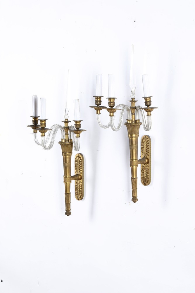 Lotto composto da lampadario e coppia di appliques in bronzo dorato e vetro. XIX-XX secolo