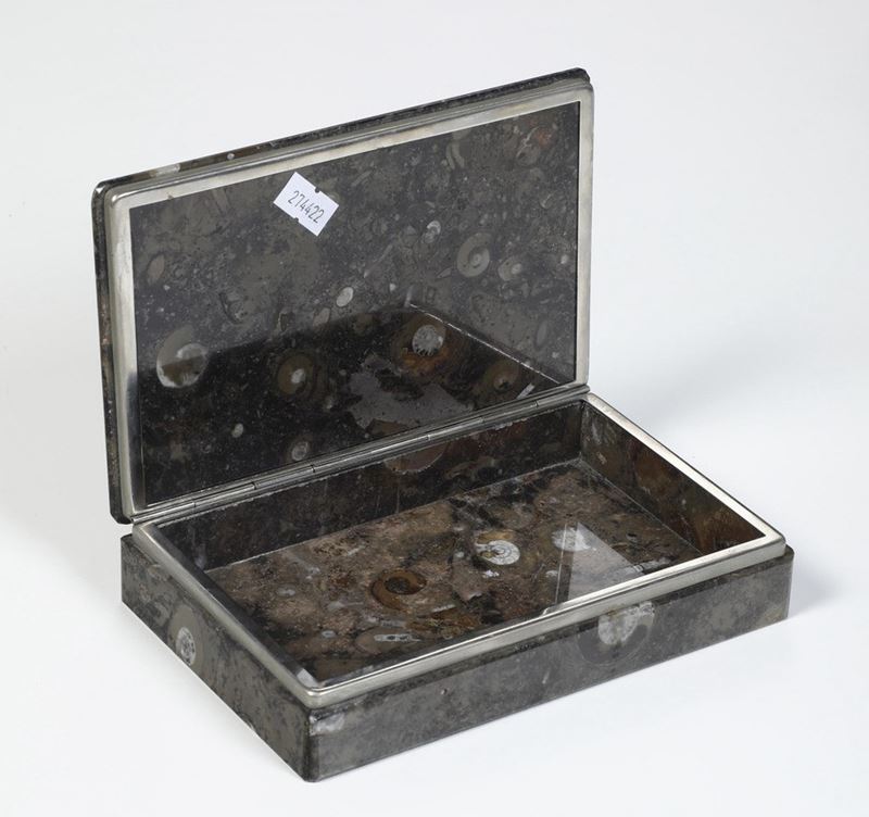 Scatola con ammoniti fossili su pietra dura