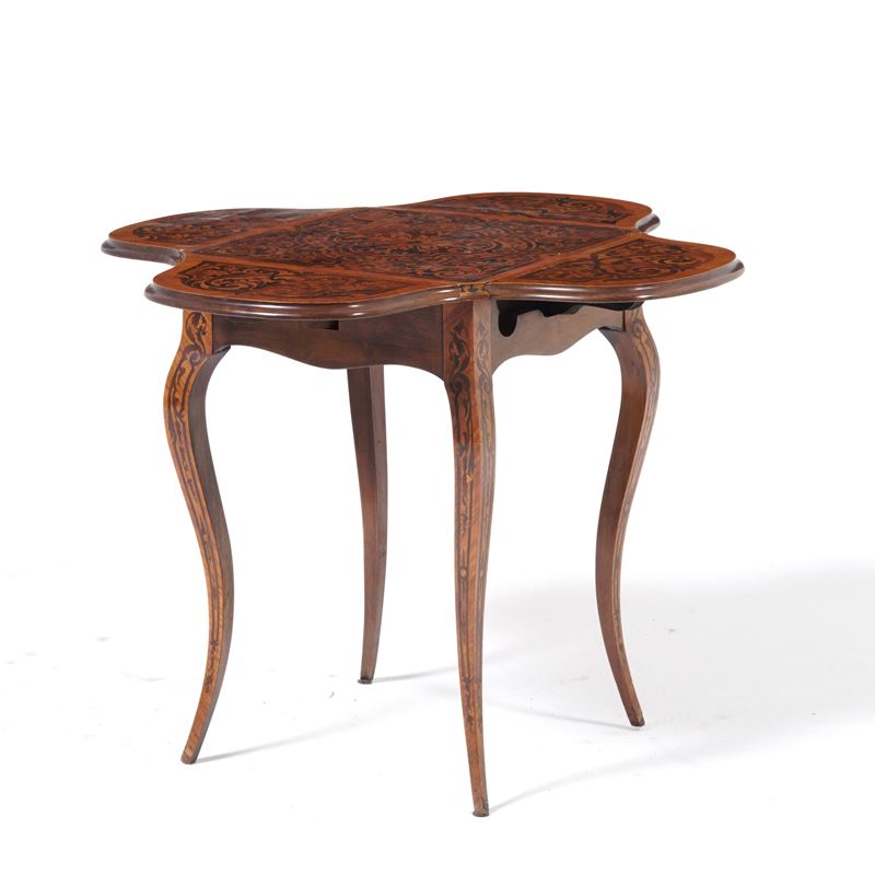 Tavolino ad alette in legno intarsiato. XIX-XX secolo