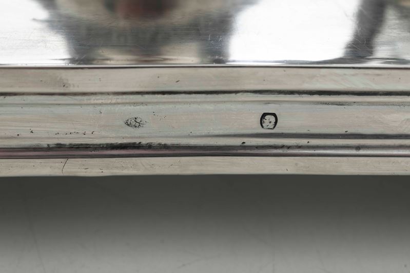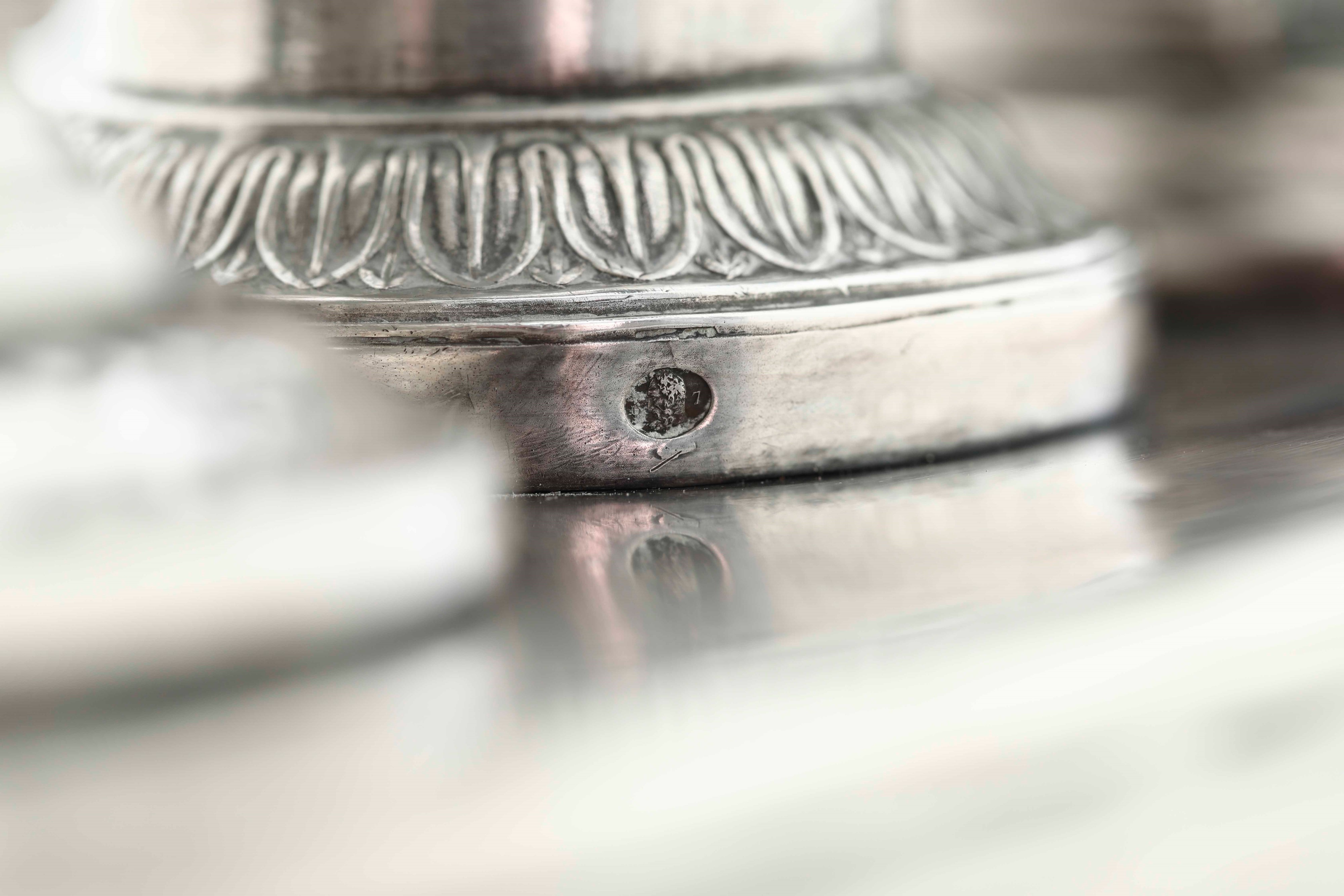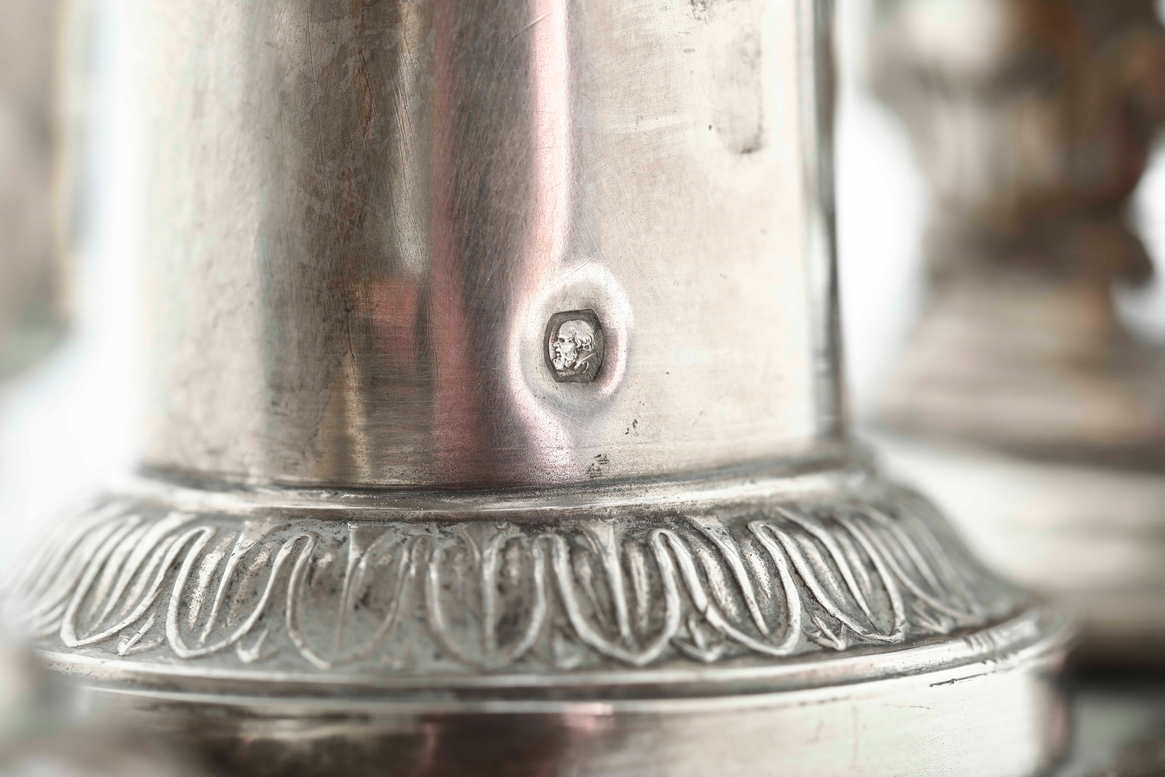 Unreadable silversmith's mark. Molten, embossed and chiselled silver. Cut glass cruets (not relevant)