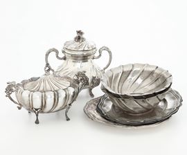Due zuccheriere, due coppe da macedonia e tre piattini. Argenteria italiana del XX secolo