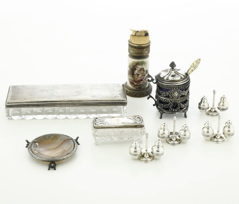 Lotto di piccoli oggetti in argento e altri materiali. XX secolo