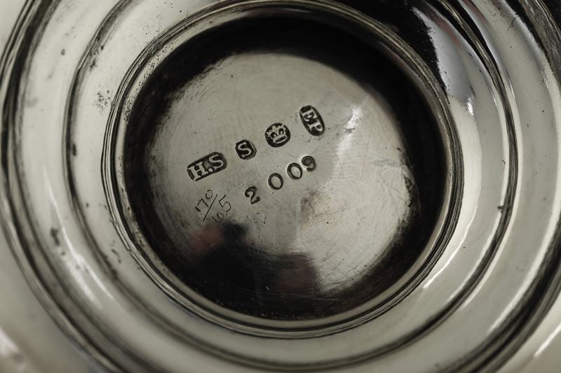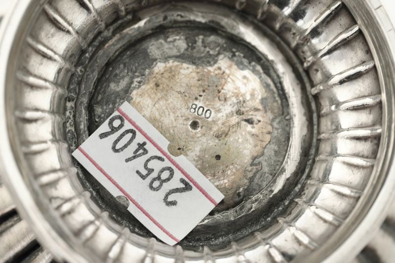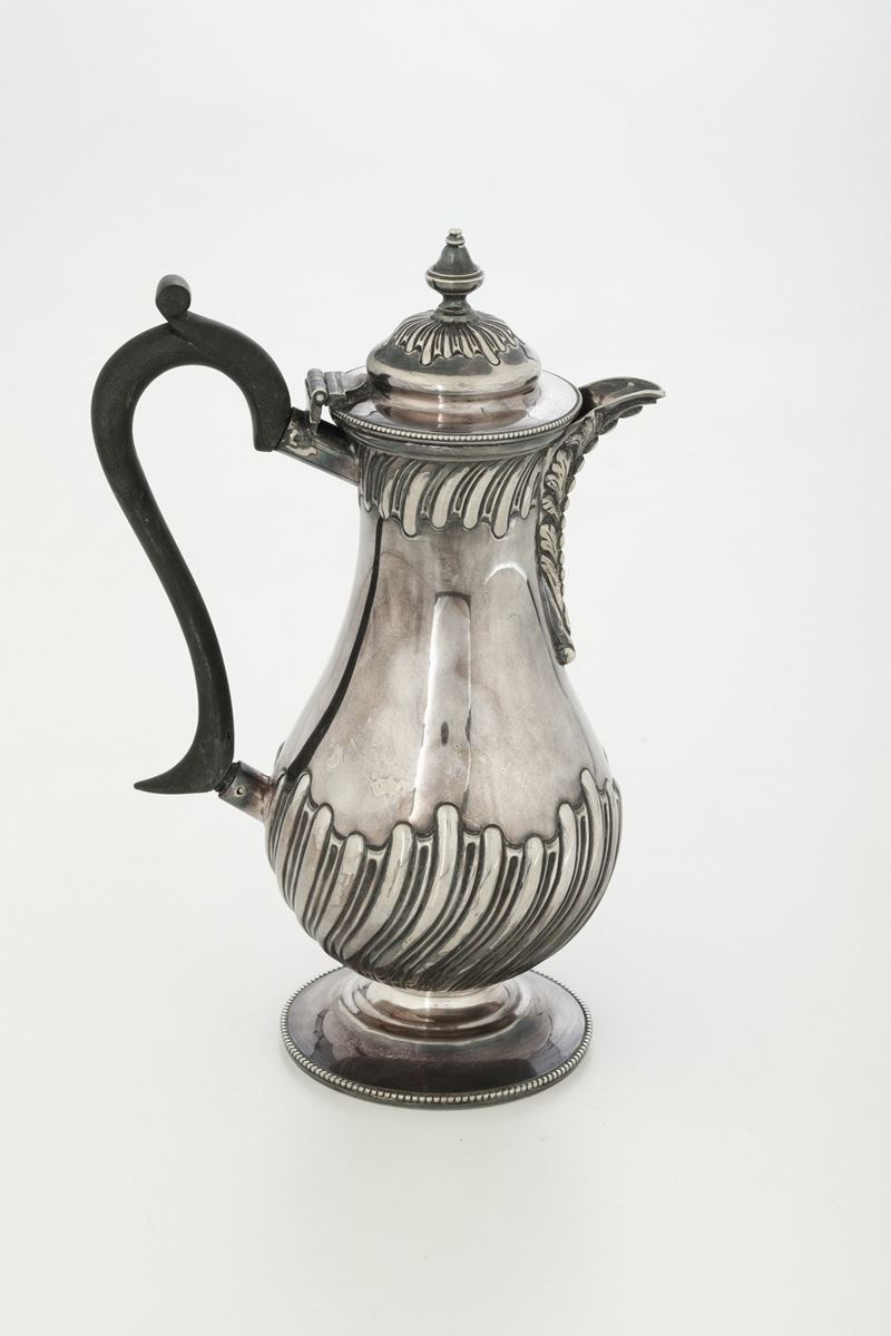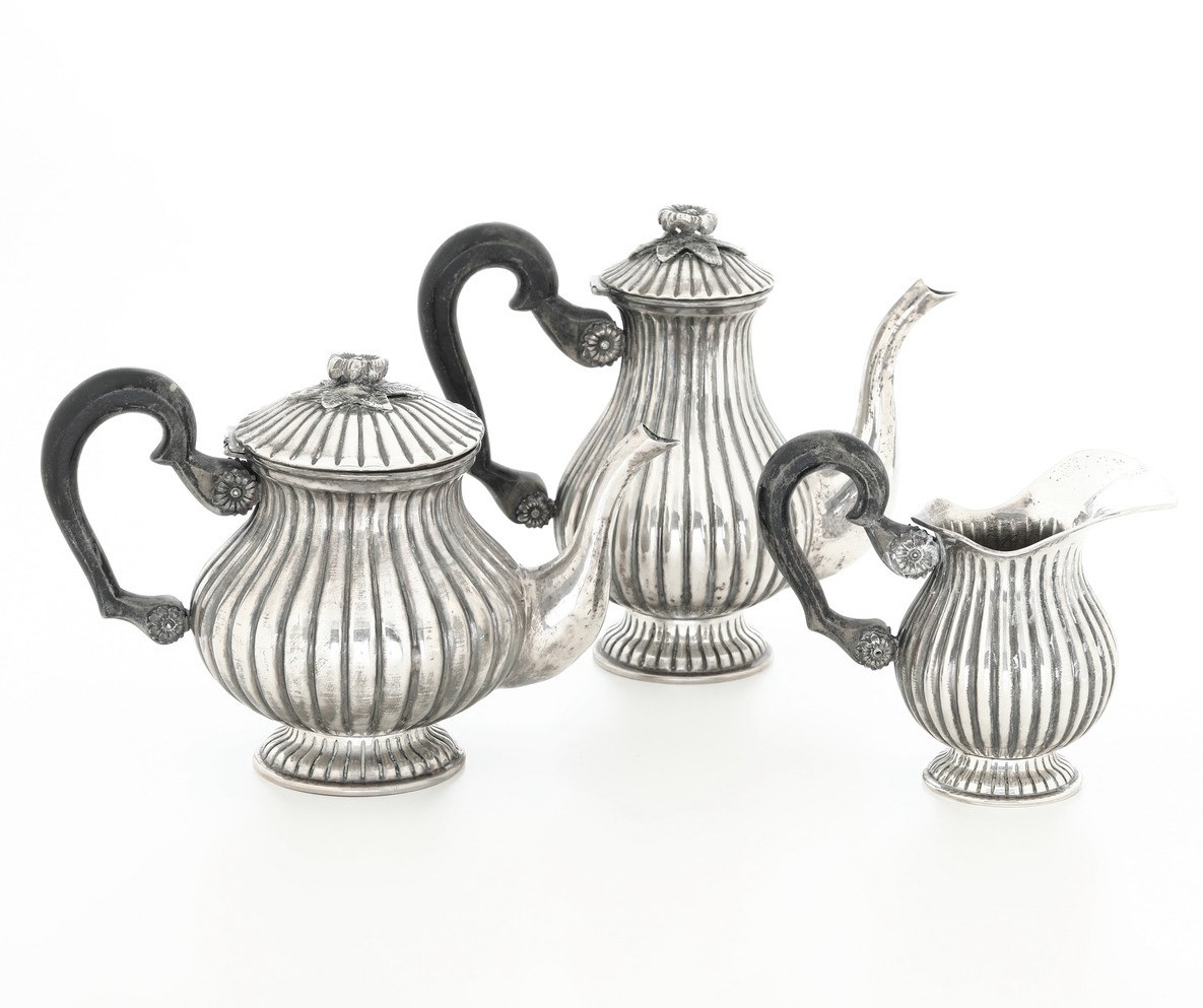 Servizio da tè e caffè in metallo argentato e caffettiera in argento 800.