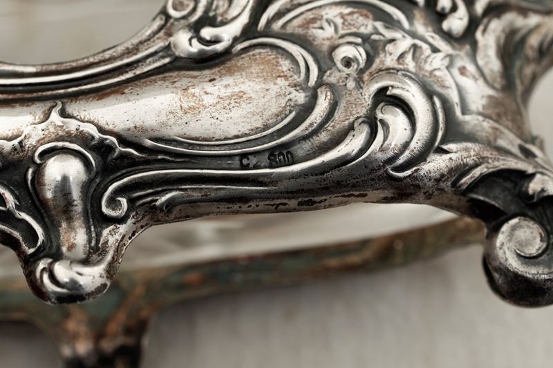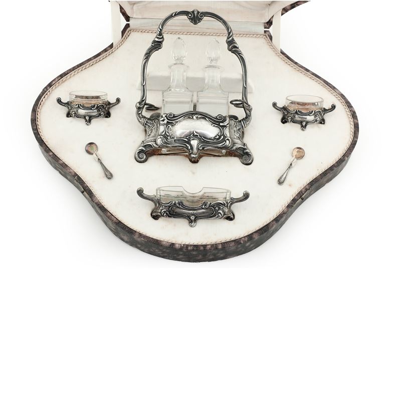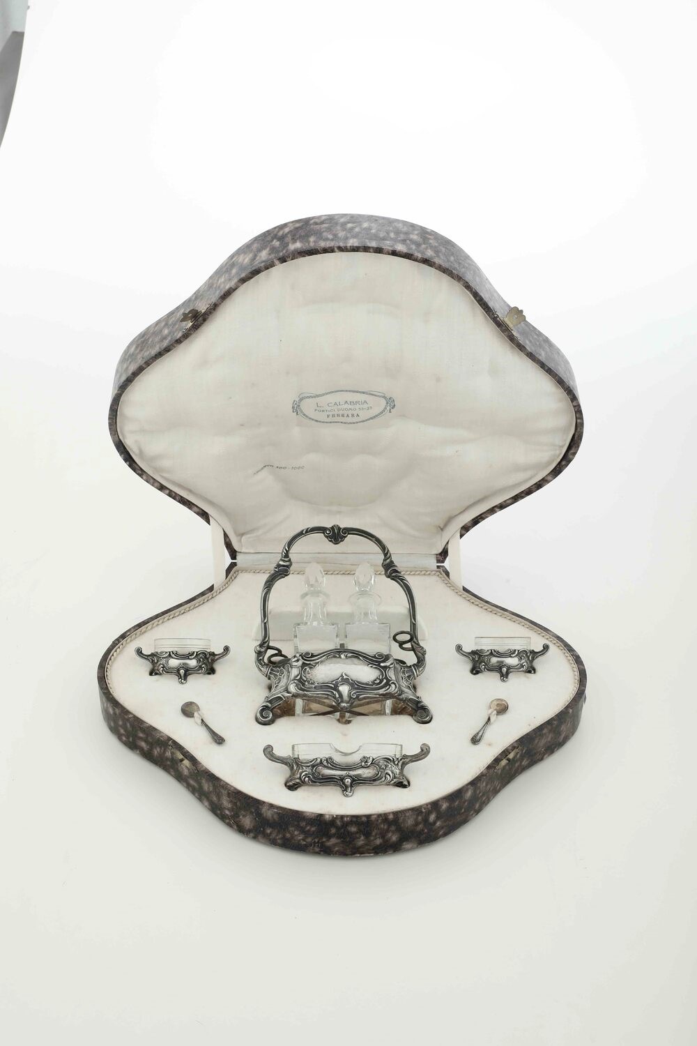 Set da tavola con oliera, due saliere, porta stuzzicadenti. Argenteria italiana della prima metà del XX secolo