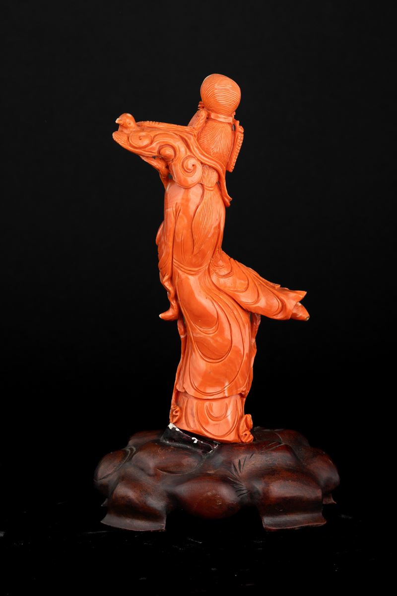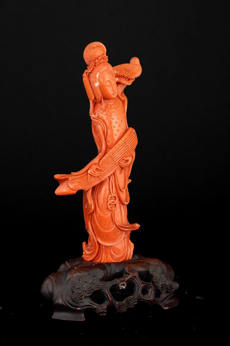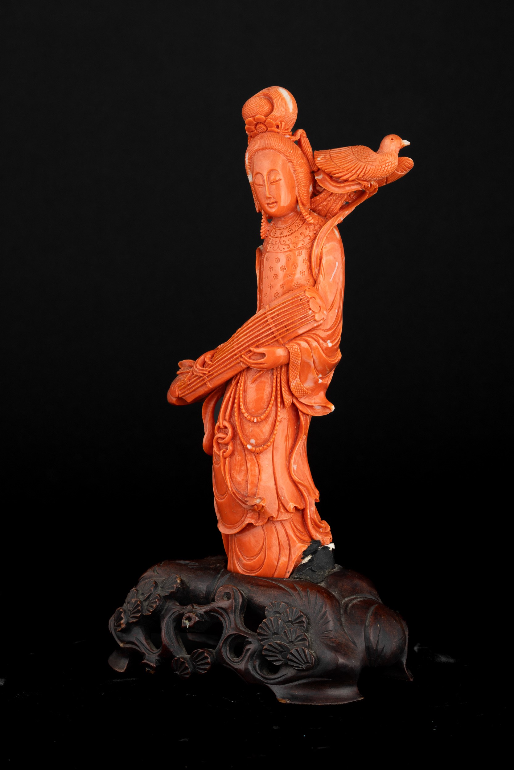 A carved coral Guanyin with birds, 708 gr, China, Qing Dynasty, late 19th century