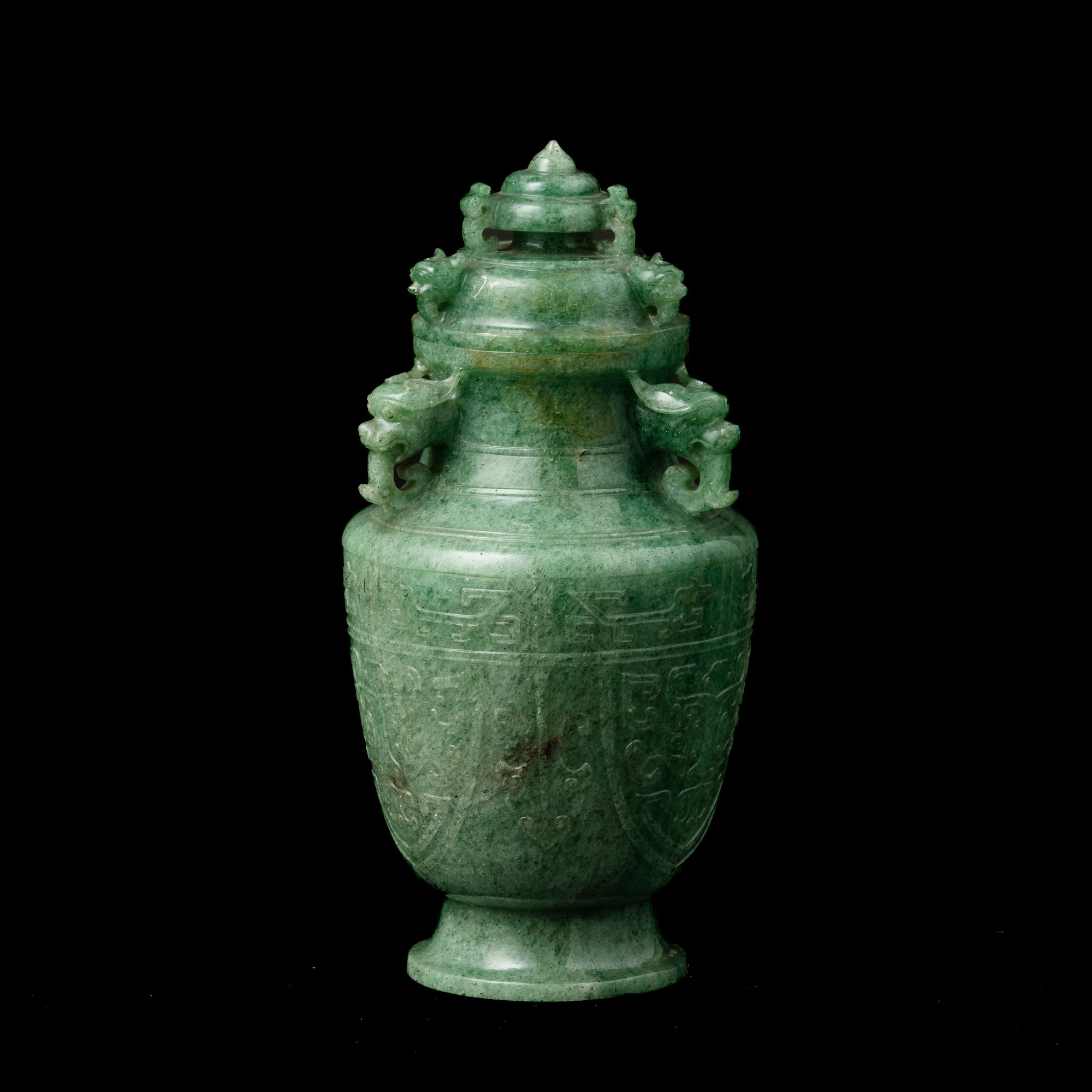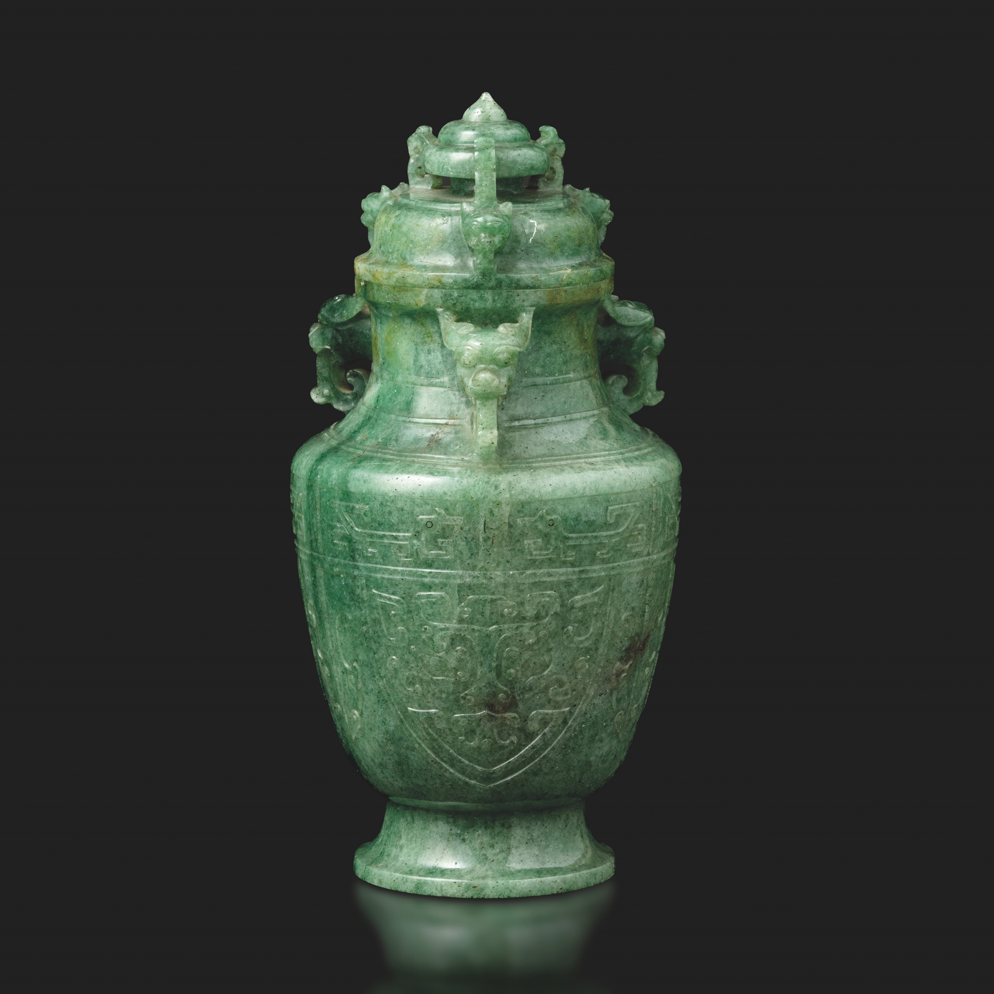 Apple-green jade potiche carved with geometric decorations and handles in the shape of fantastic animals, China, Qing Dynasty, [..]