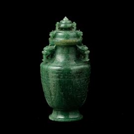 Apple-green jade potiche carved with geometric decorations and handles in the shape of fantastic animals, China, Qing Dynasty, 19th century