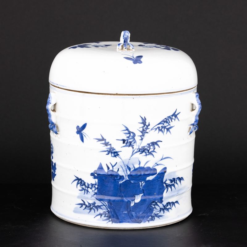 Blue and white porcelain container with lid, naturalistic subject, China, Qing Dynasty, Daoguang era (1821-1850)