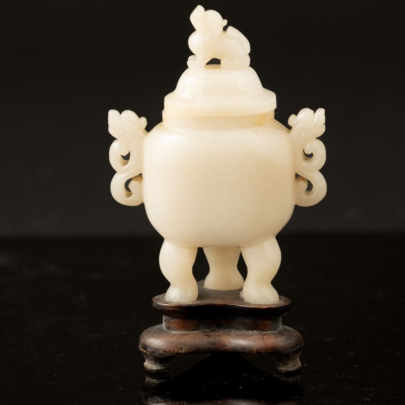 Carved jade tripod container with shaped handles and Pho dog-shaped lid socket, China, Qing Dynasty, 19th century