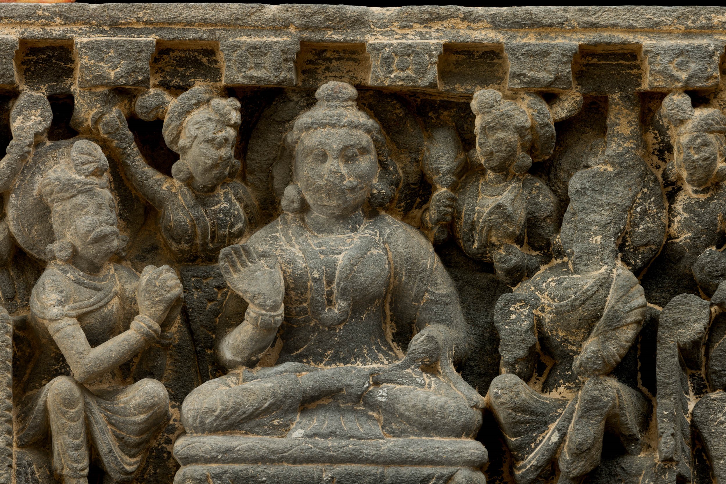 Carved stone relief with central figure of Buddha Sakyamuni and acolytes, Gandhara