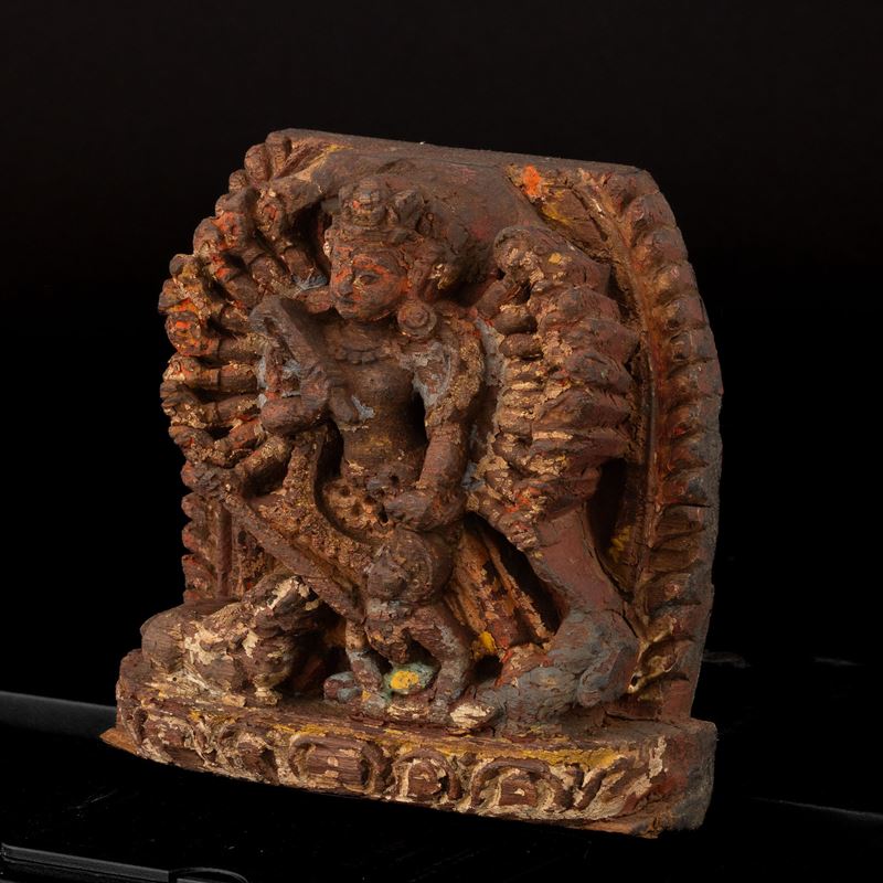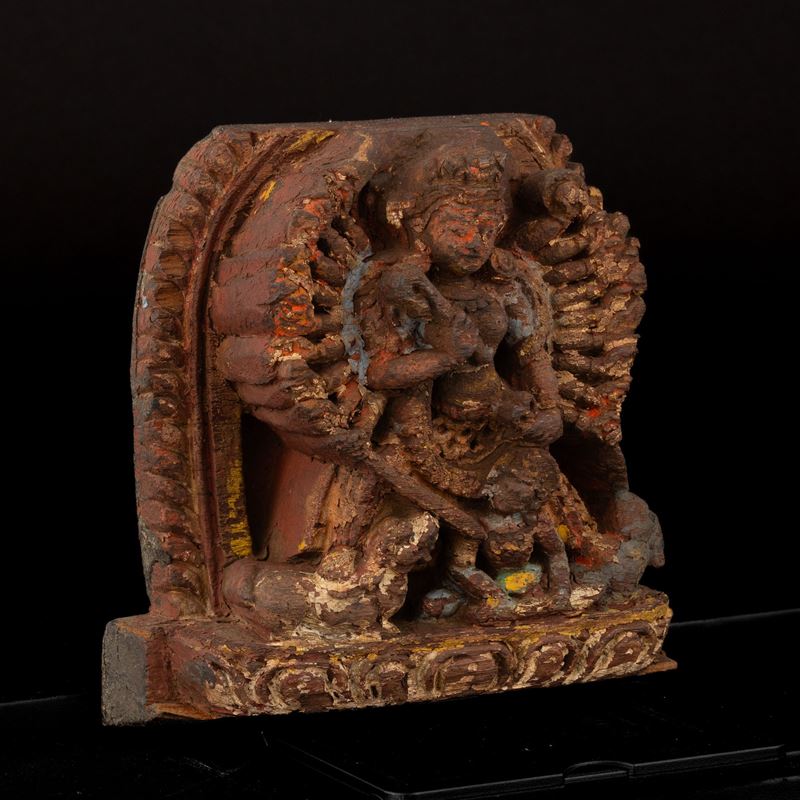 Carved wood relief with traces of polychrome depicting Mahishasuramardini, Nepal, 18th century