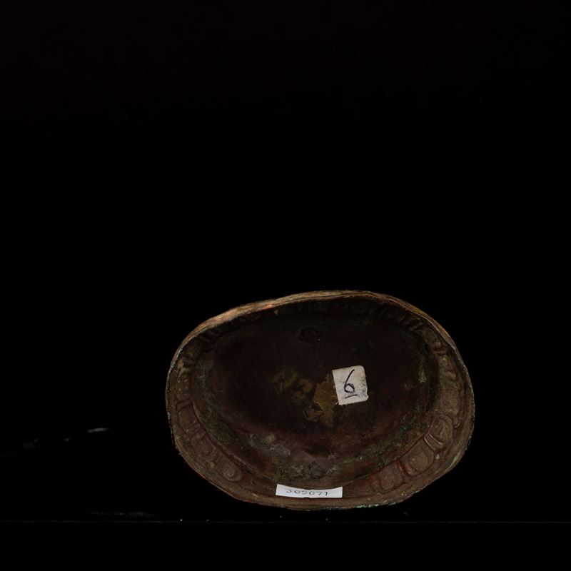 Figure of Buddha Sakyamuni seated on double lotus blossom in repoussé copper, Tibet, 17th - 18th century