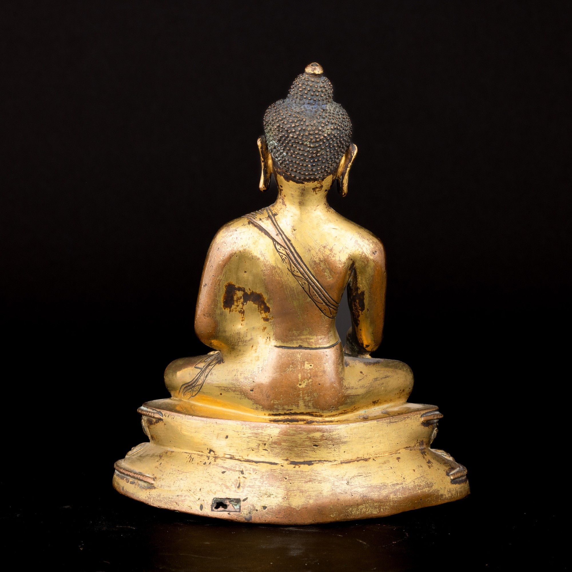 Figure of Buddha Sakyamuni seated on double lotus flower in gilded bronze with traces of polychromy, oxidation and gilding, Tibet, 17th century
