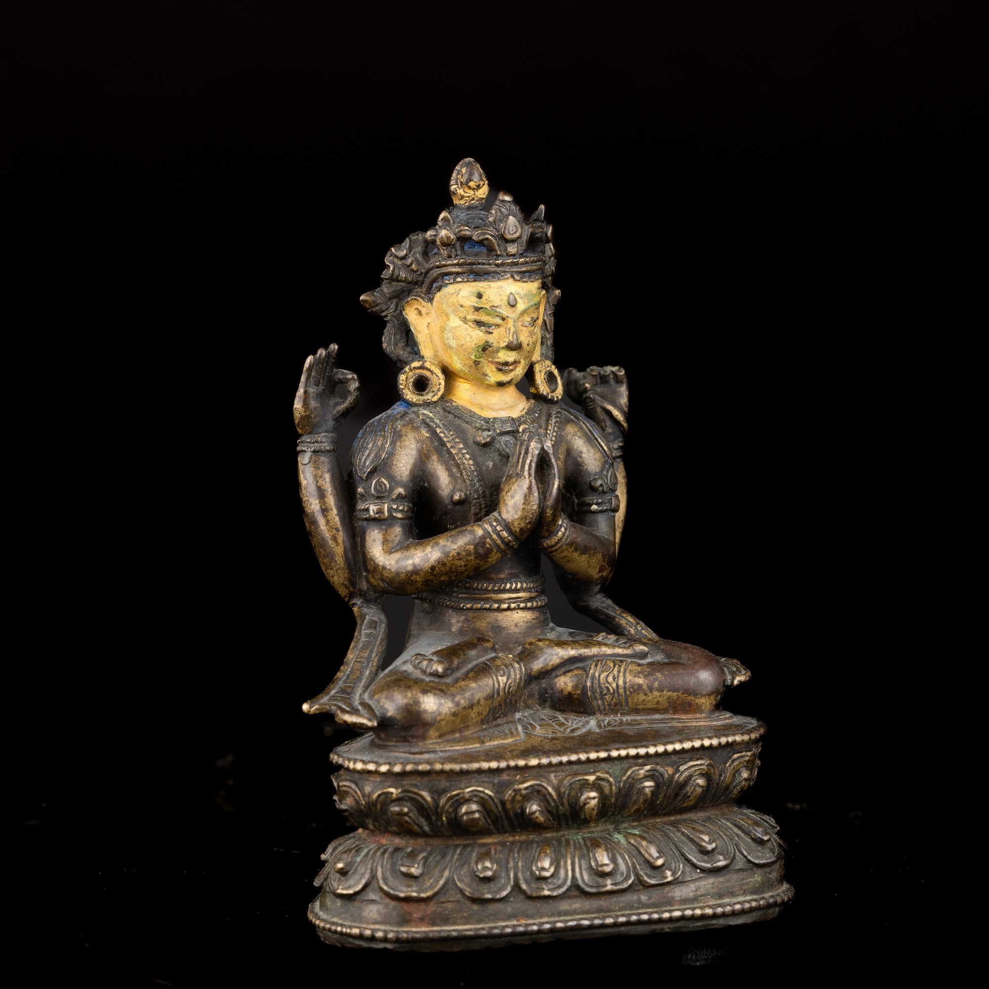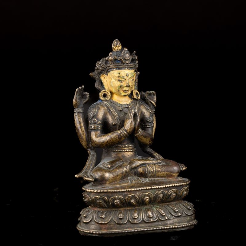 Figure of Shadakshara seated on double lotus blossom in partially gilded and chilled bronze, Tibet, 18th century