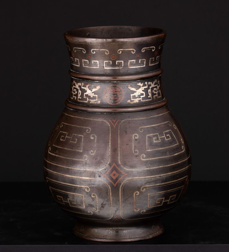 Geometrically patterned bronze vase with copper and silver inserts, China, Qing Dynasty, Qianlong period, 18th century