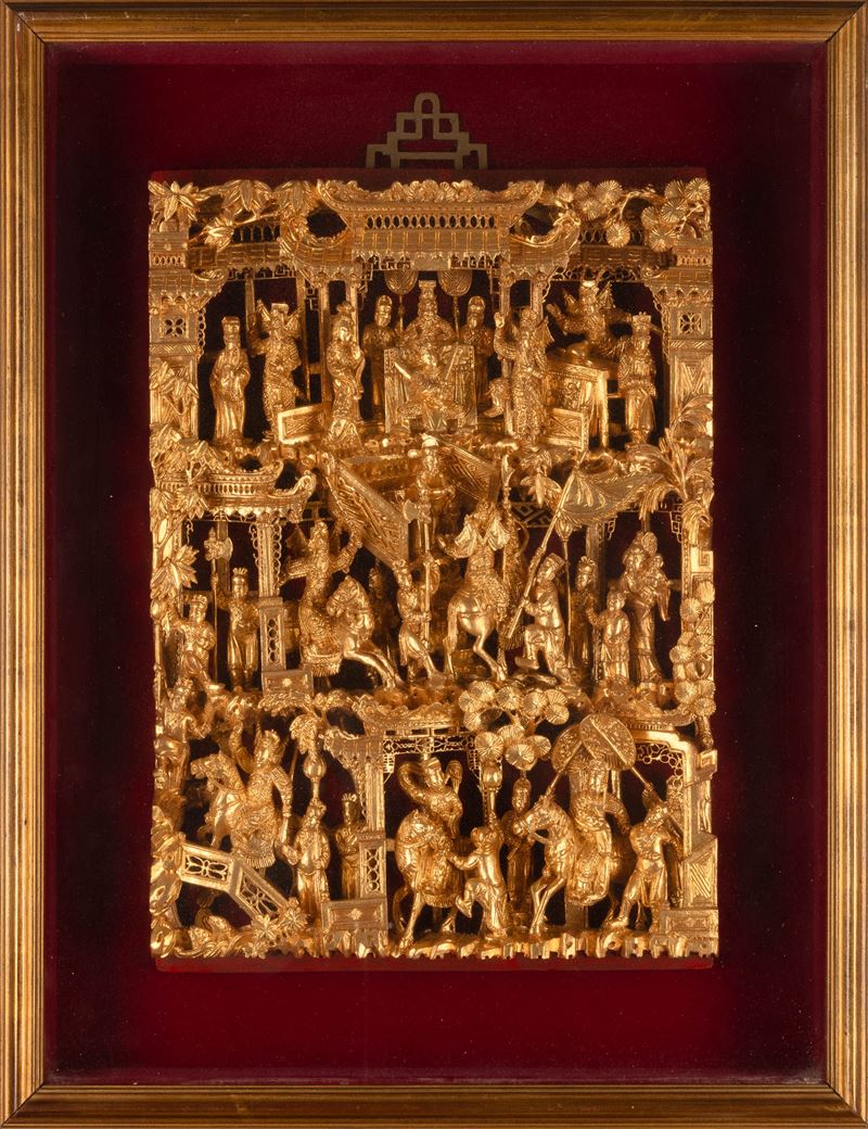 Gilded carved wooden panel within frame depicting court scenes, Guangzhou, China, 19th century