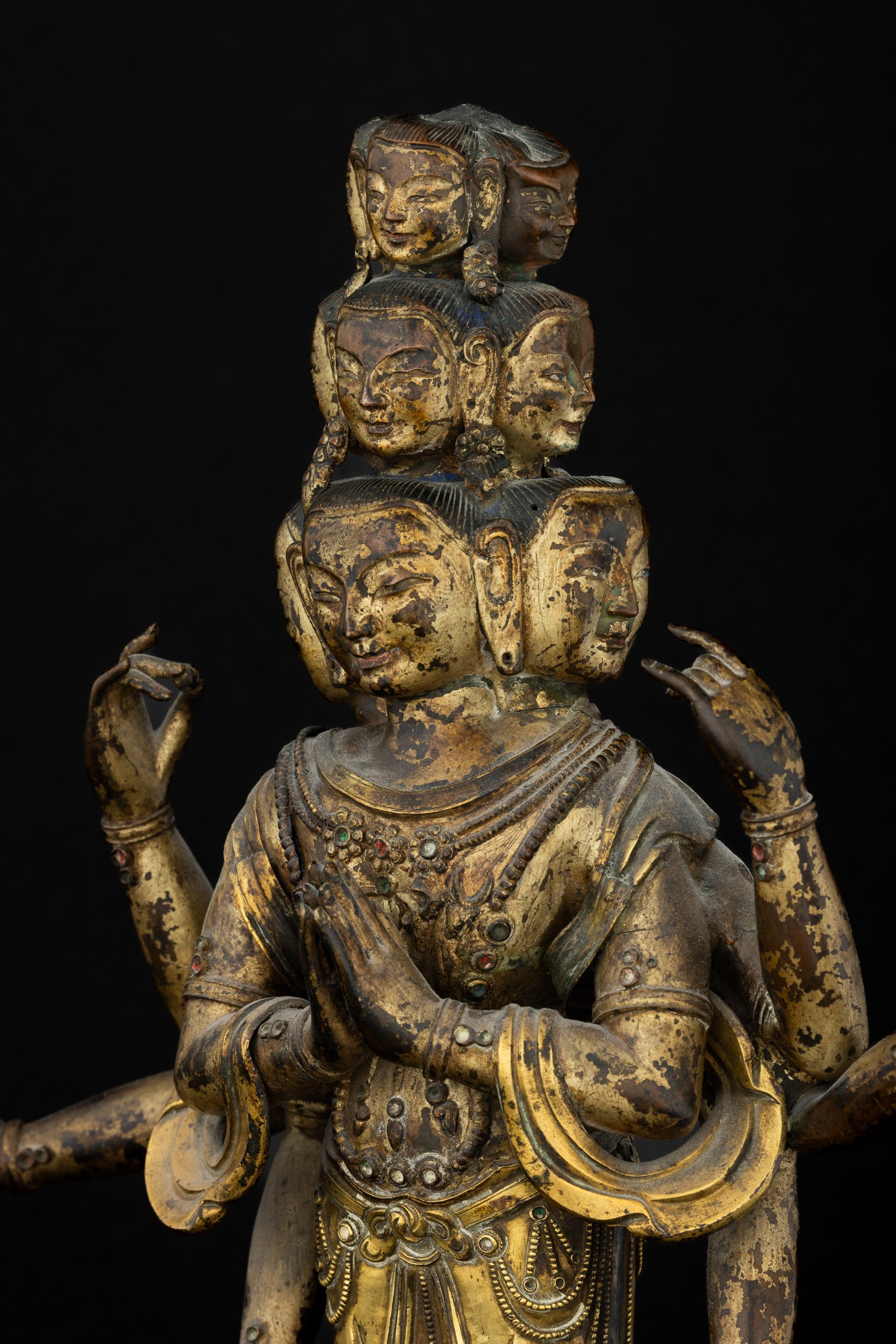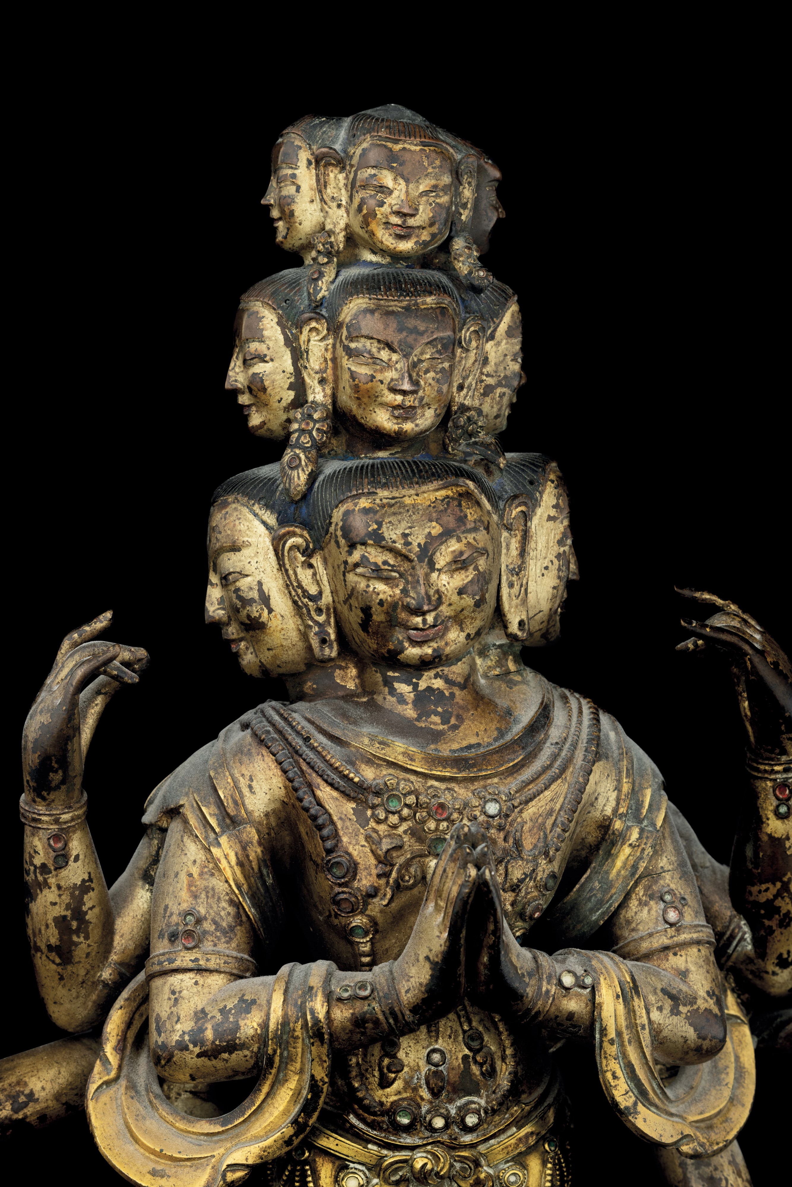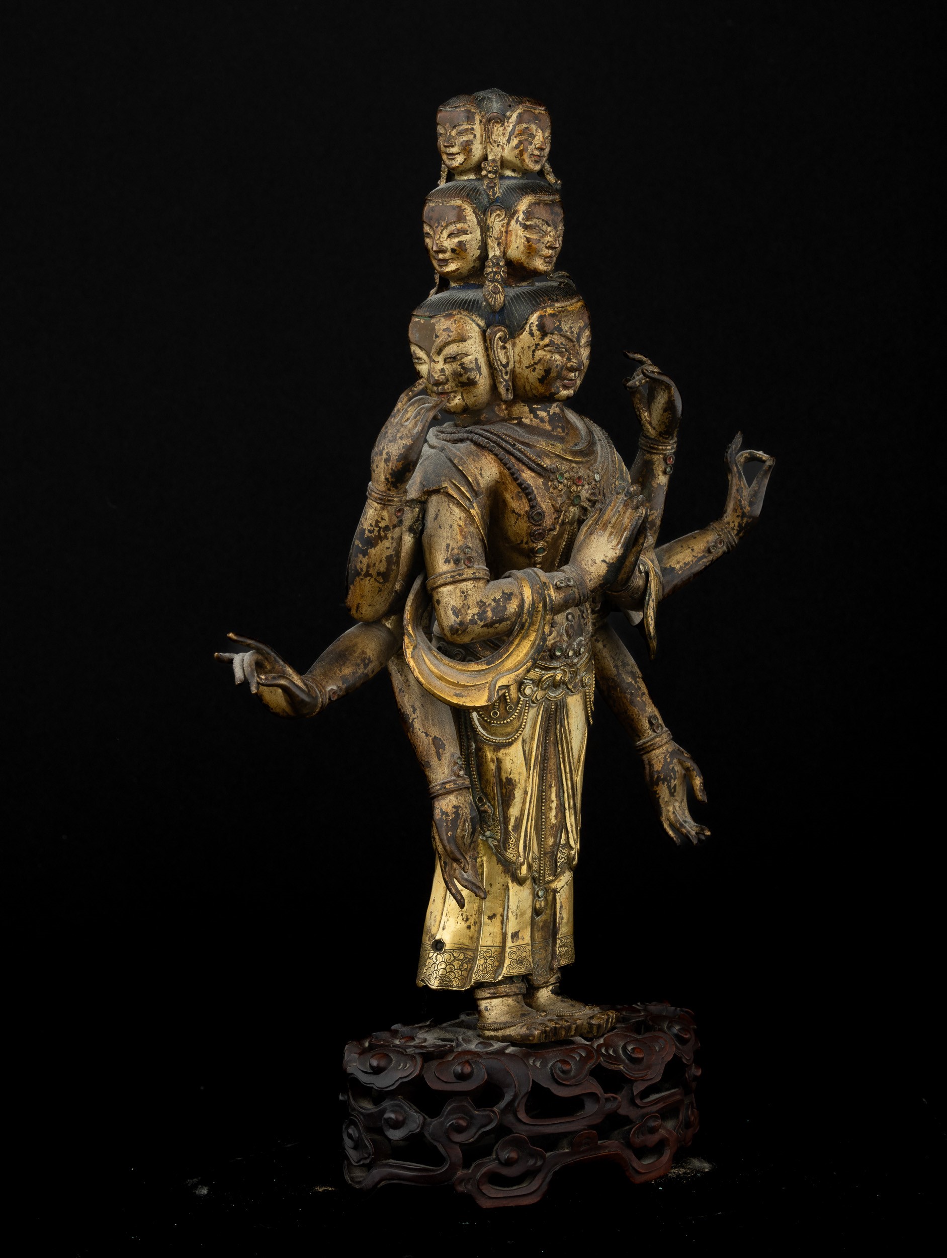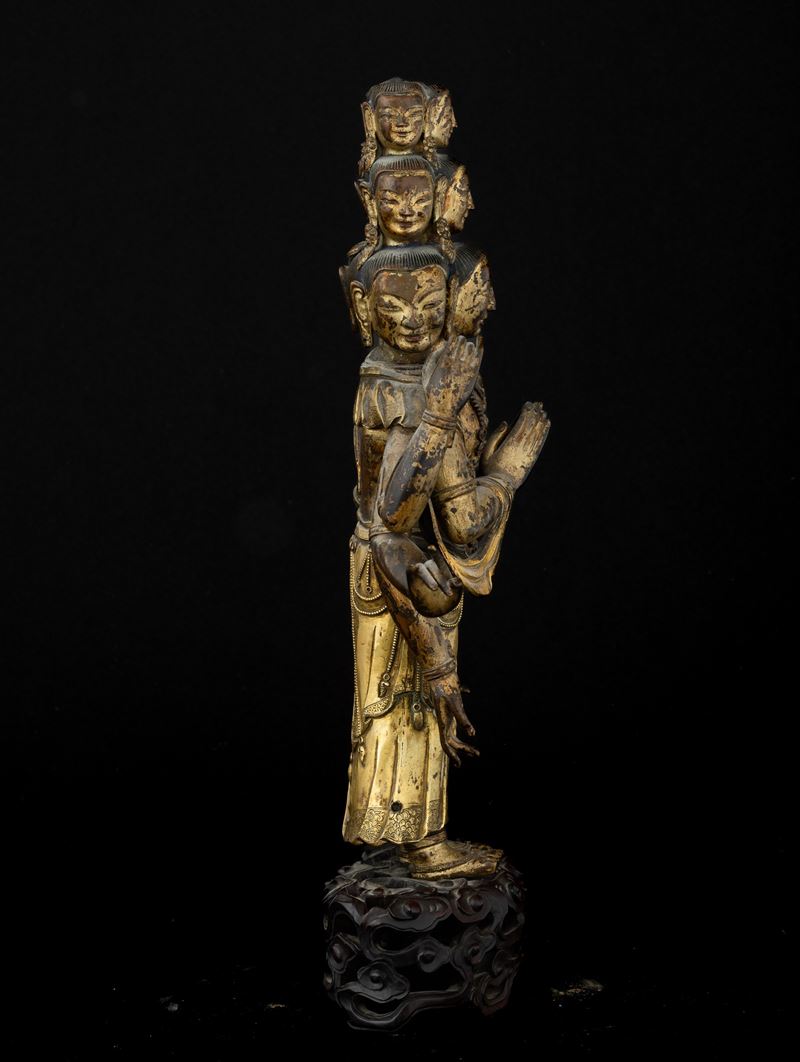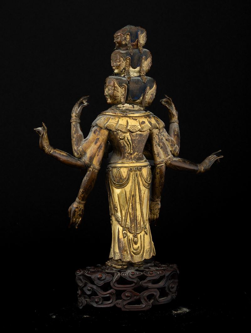 Gilt copper Avalokiteshvara figure on carved wooden base, Tibet, 17th century
