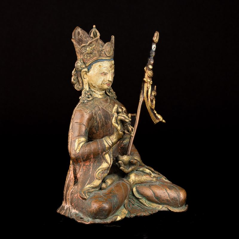 Important and rare partially gilded copper Padmasambhava figure, Tibet, 15th - 16th century