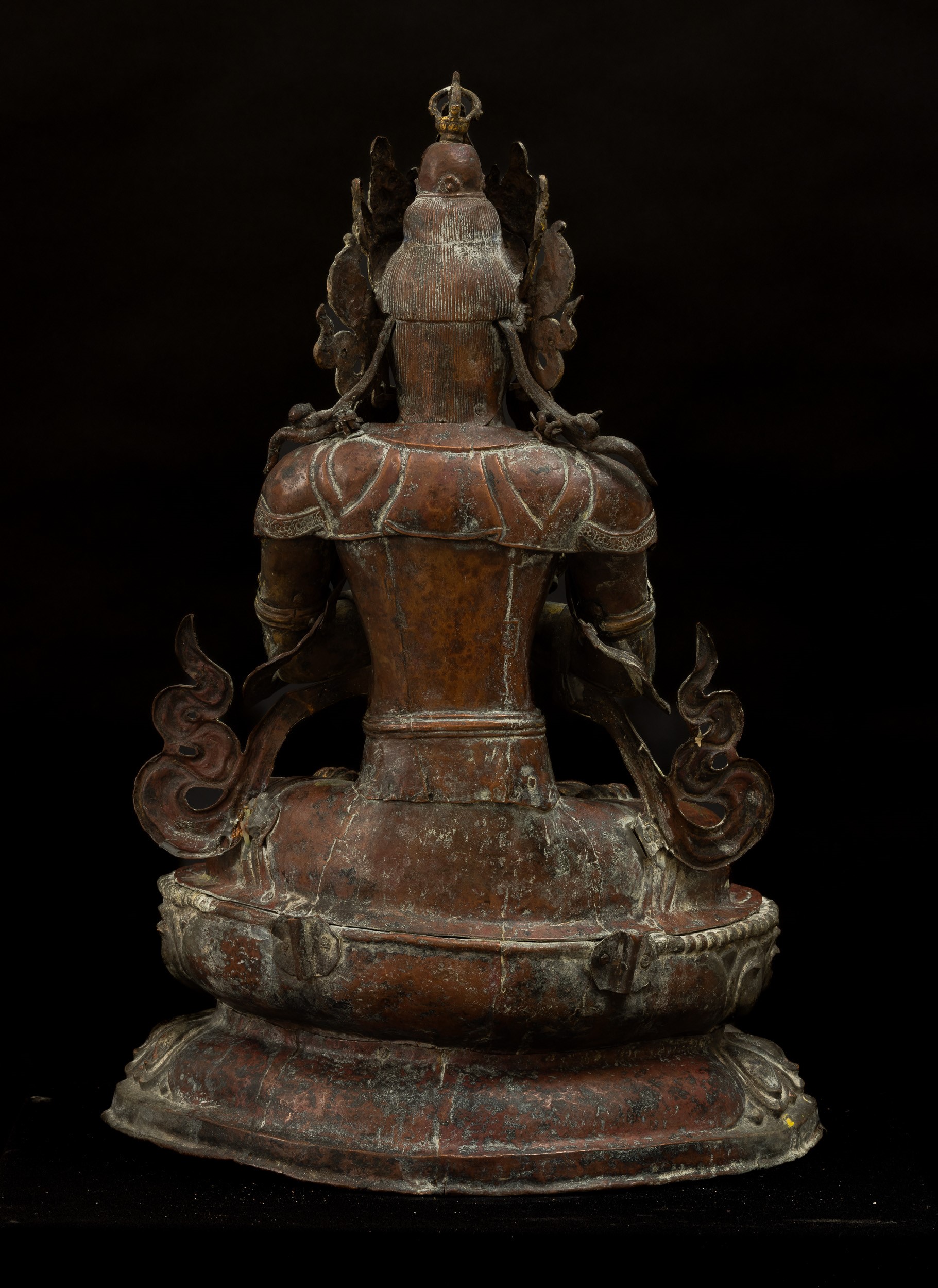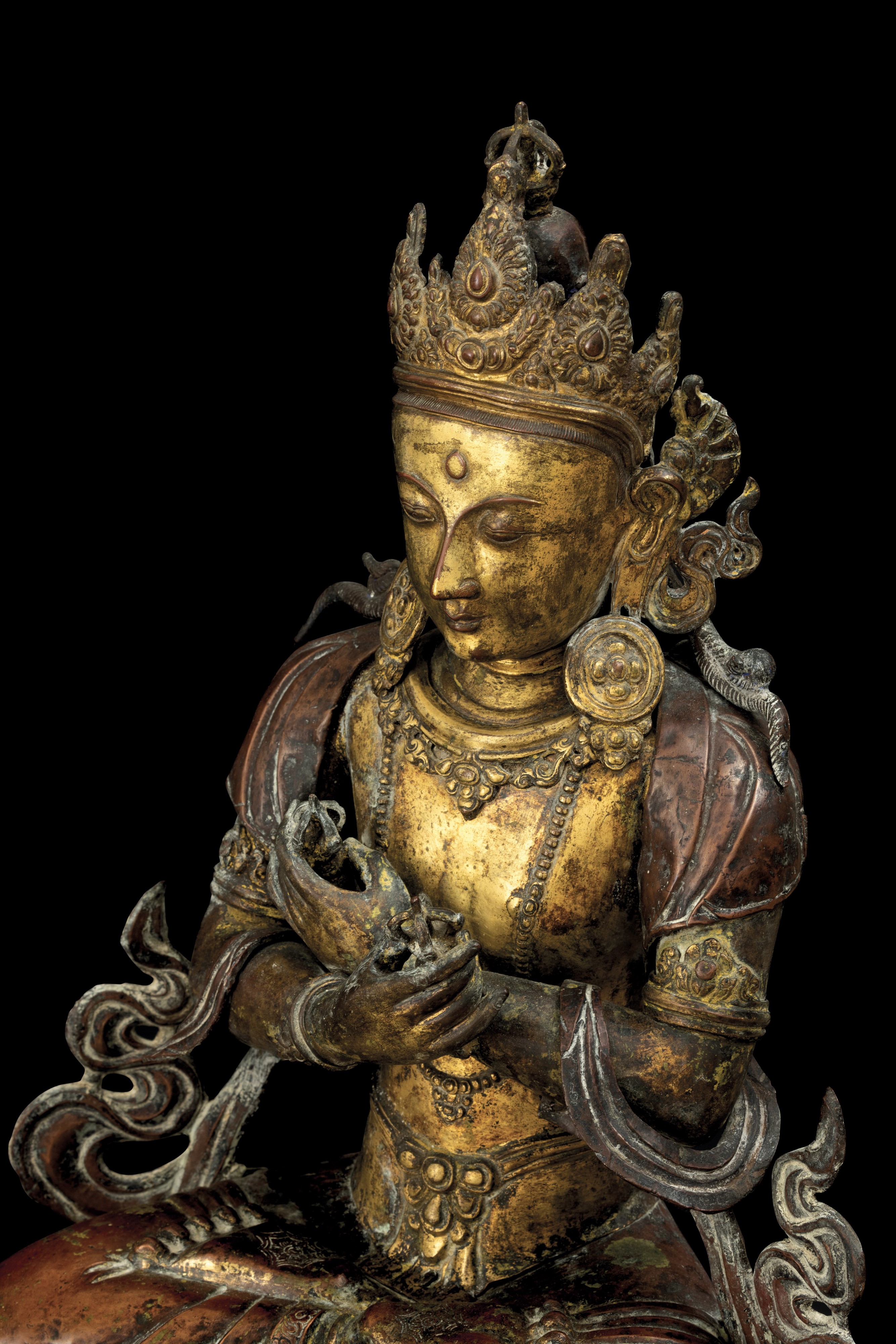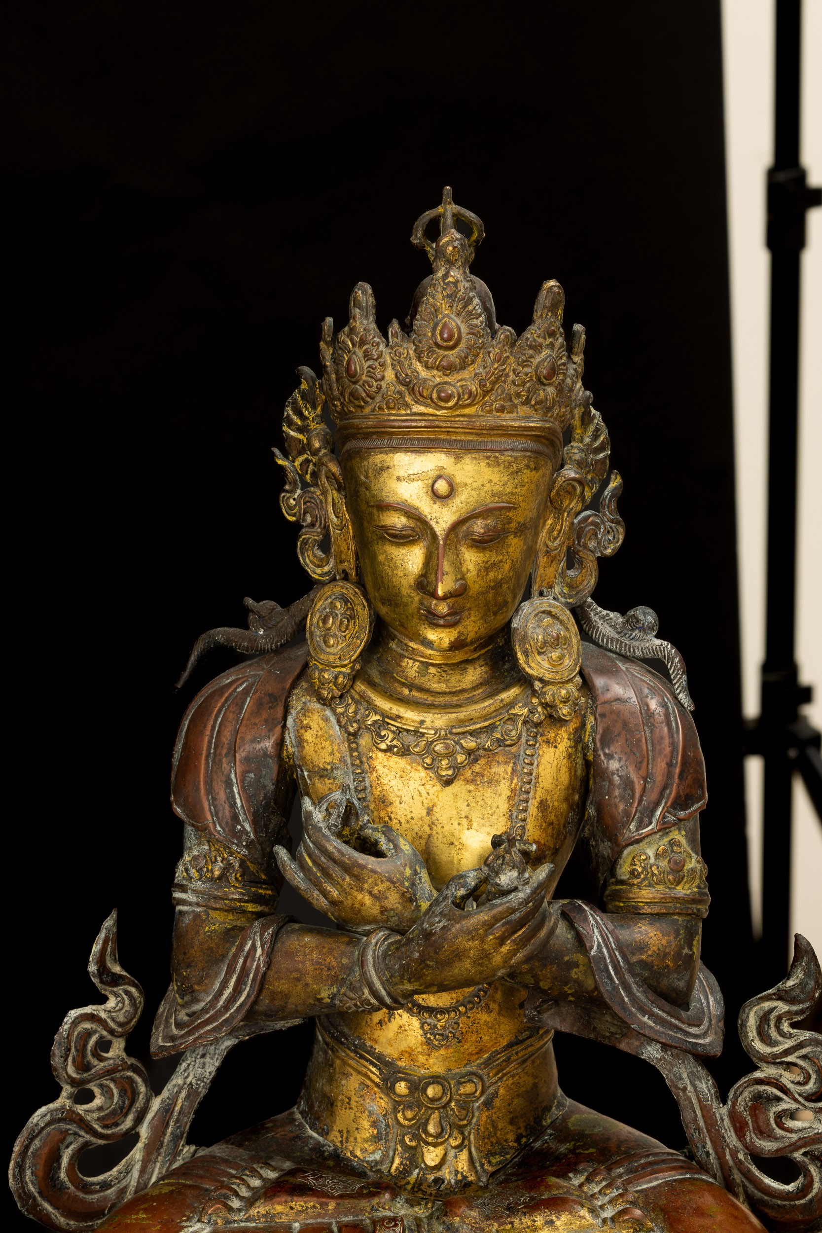 Important Vajrdara figure seated on double lotus flower in repoussé copper and partially gilded bronze, Tibet, 15th centu [..]
