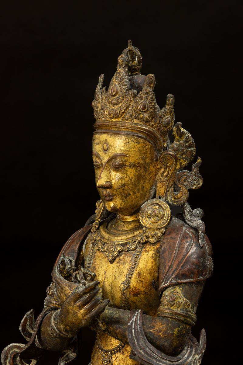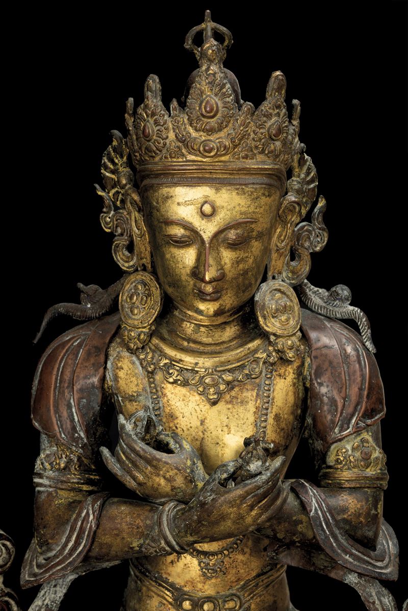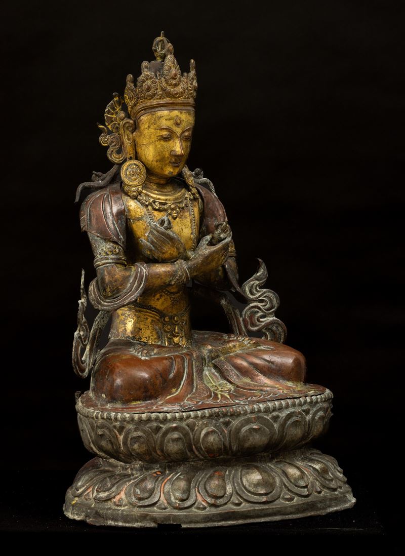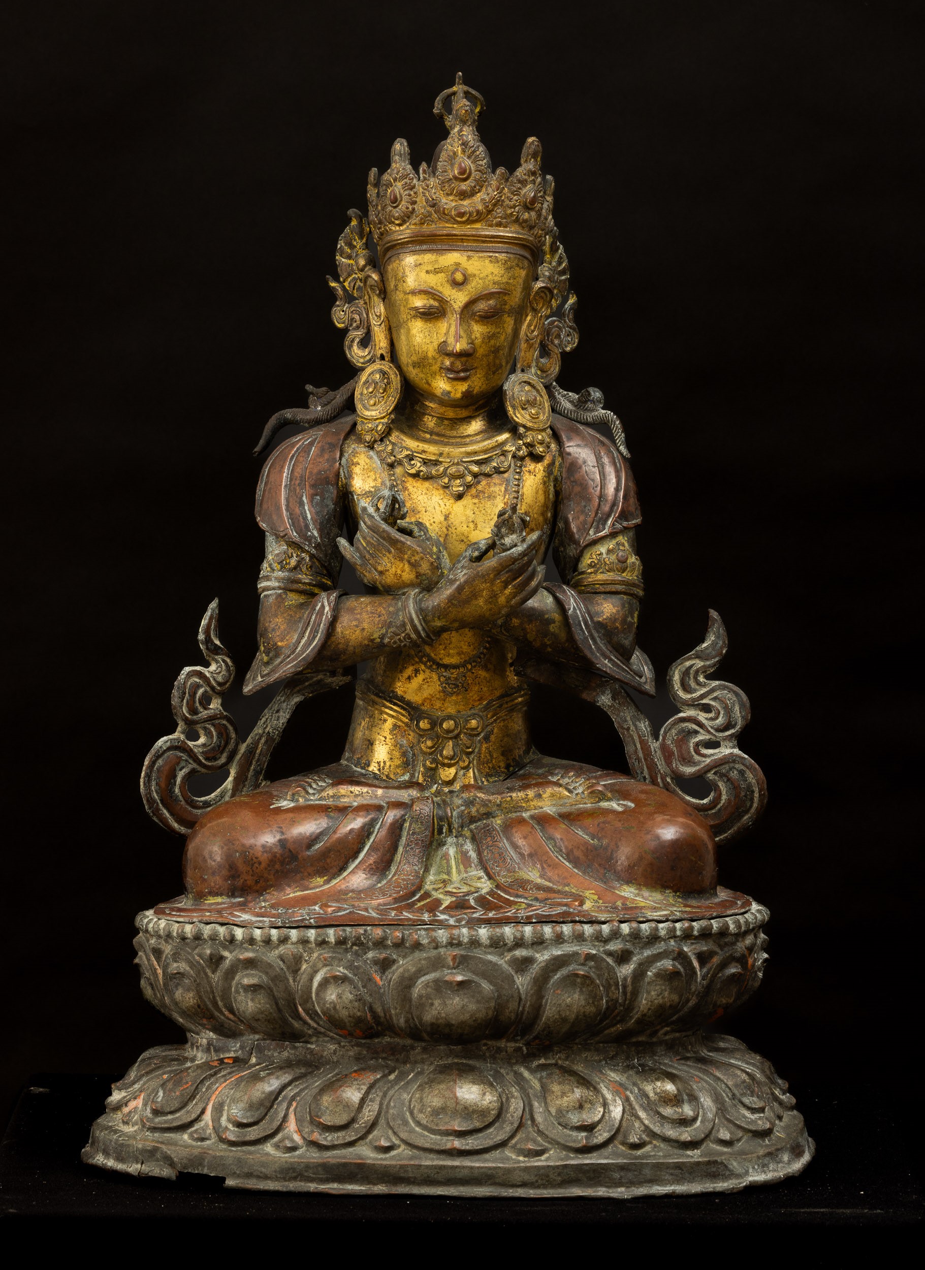 Important Vajrdara figure seated on double lotus flower in repoussé copper and partially gilded bronze, Tibet, 15th century