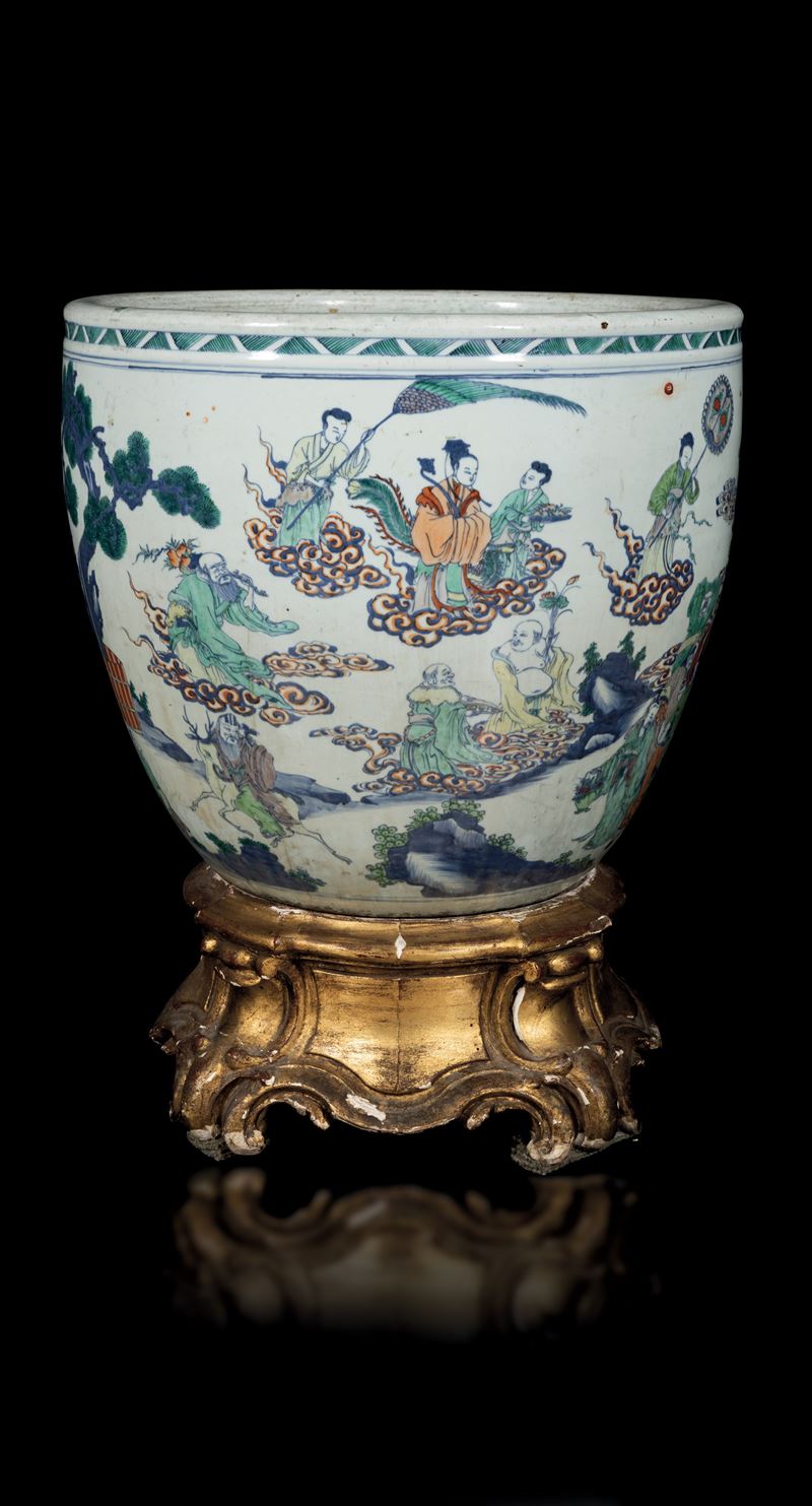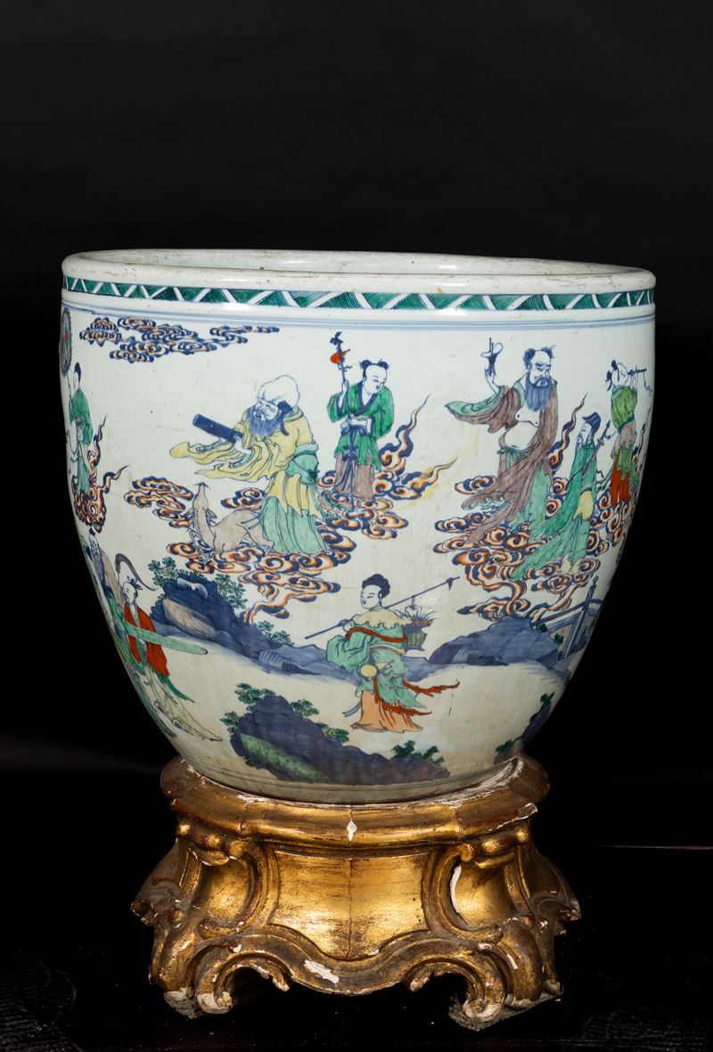 Large and important porcelain fish tank with Doucai decoration represented by the eight immortal sages, golden wooden base, [..]