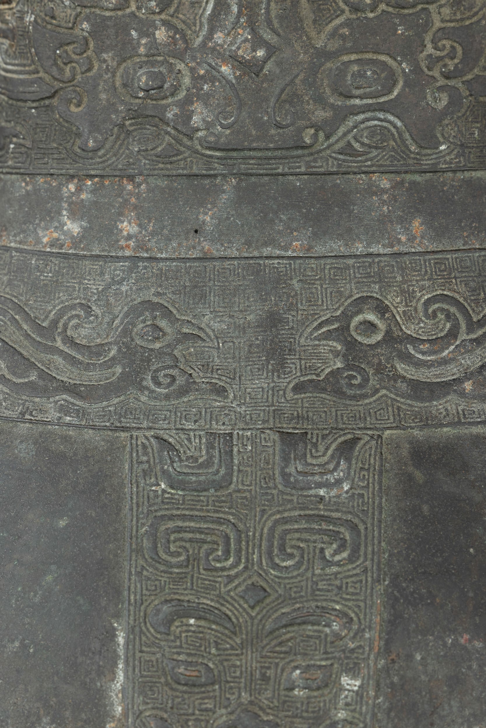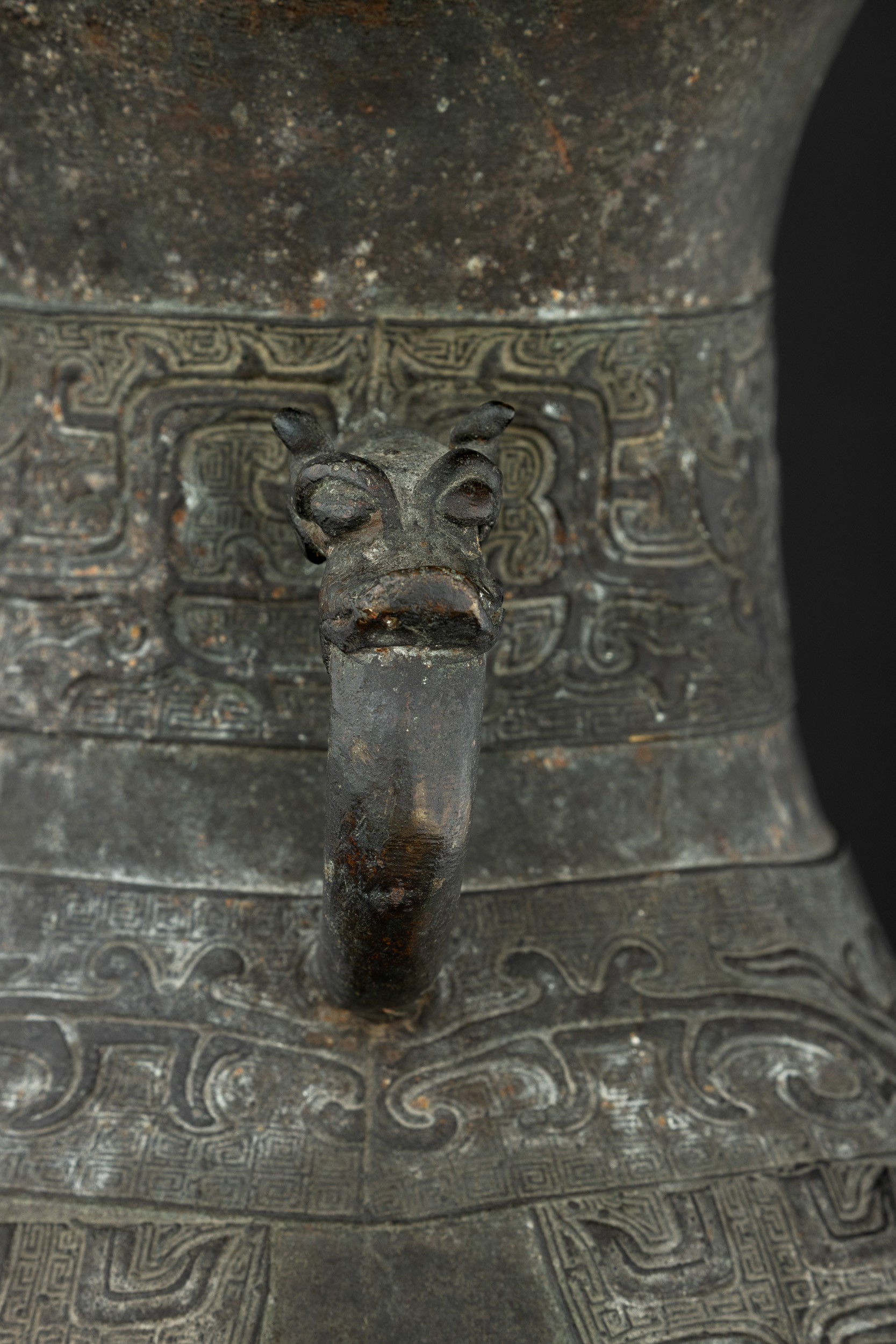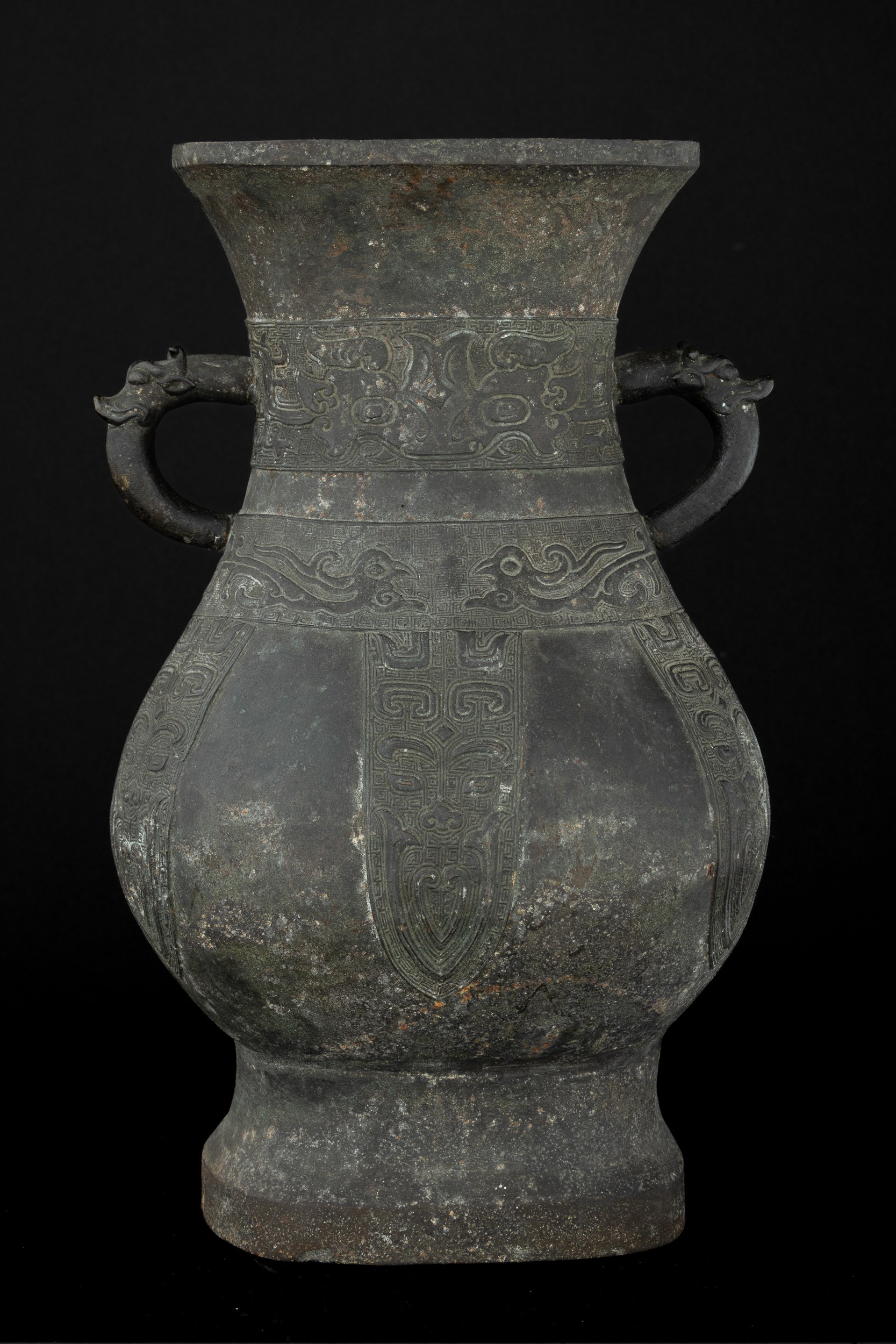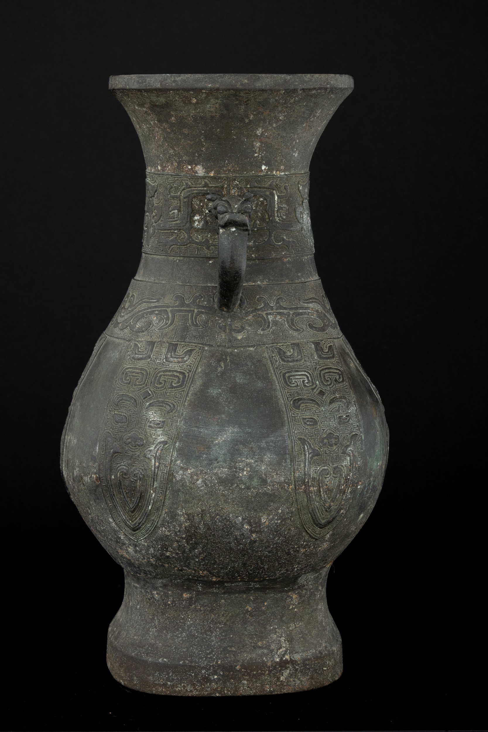 Large bronze vase in archaic form with two handles, engraved with geometric and naturalistic motifs, China, Ming Dynasty, 16th century