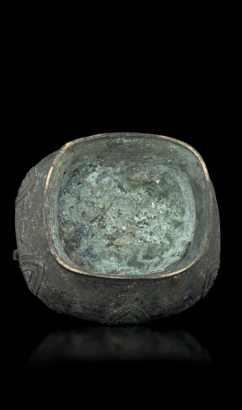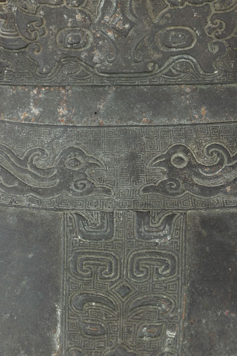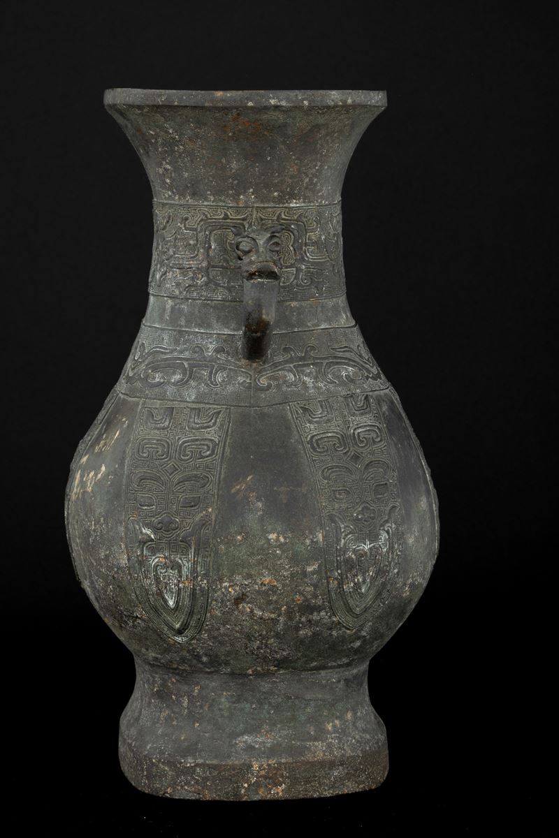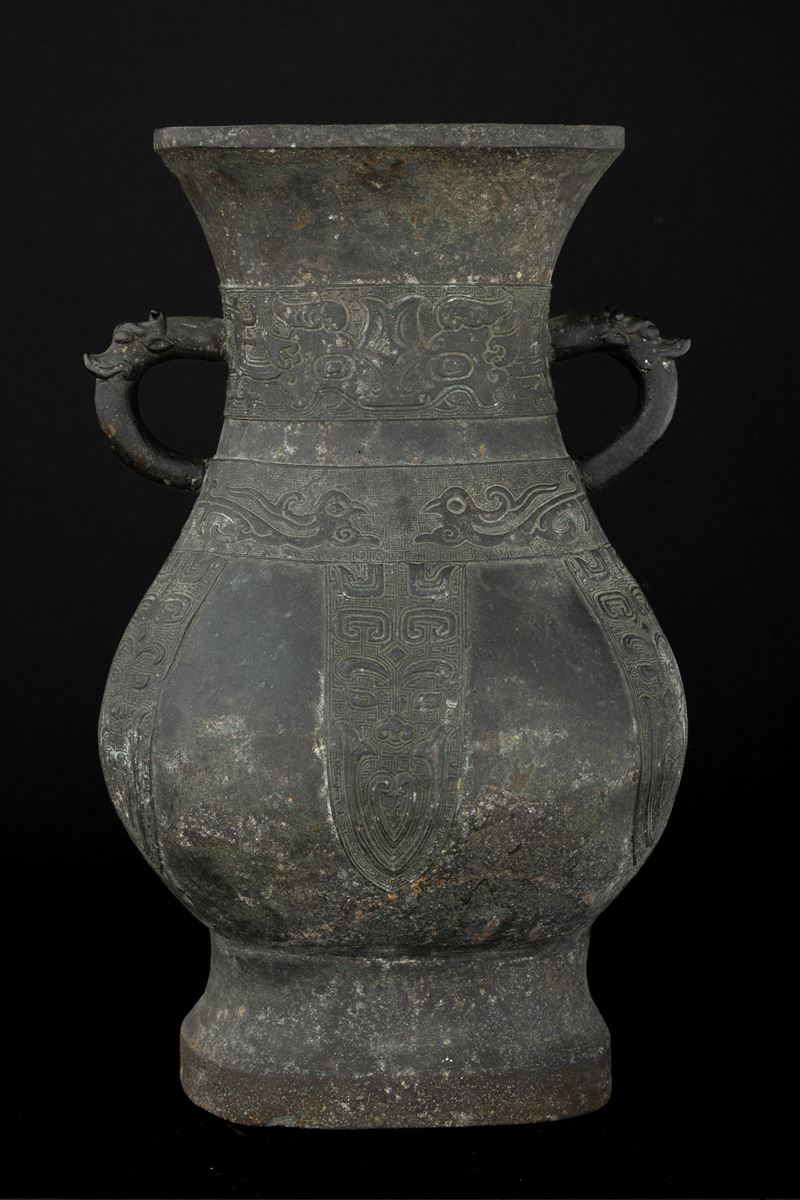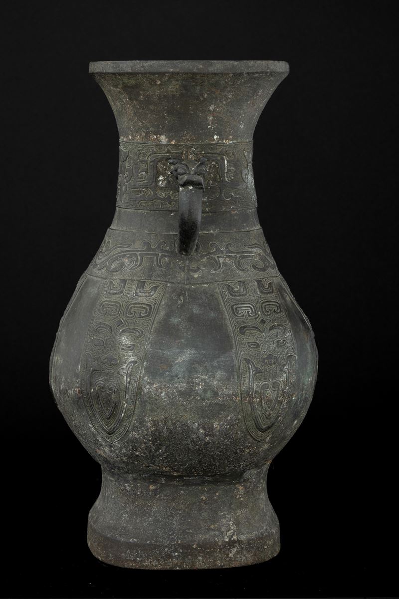 Large bronze vase in archaic form with two handles, engraved with geometric and naturalistic motifs, China, Ming Dynasty, [..]