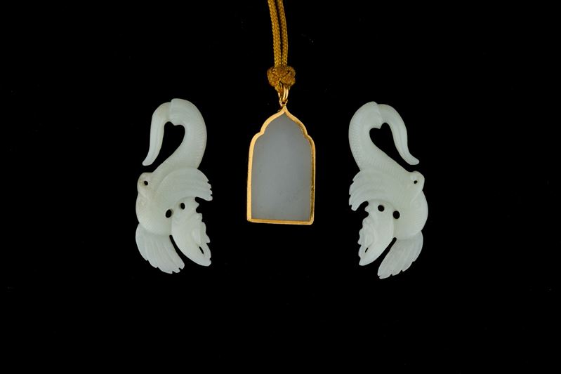 Lot consisting of 3 white jades, relief plaque with gold-mounted Buddha figure and a pair of elements with phoenixes, China, 19th century