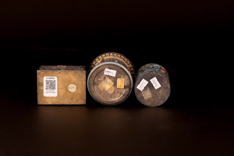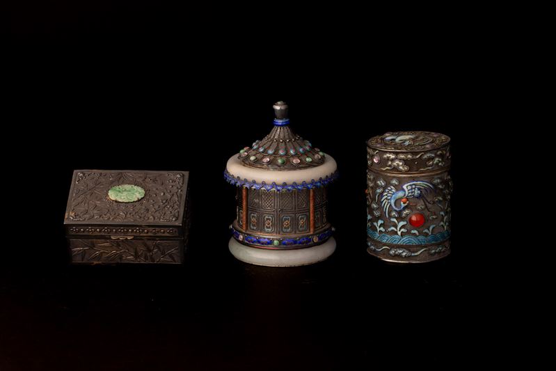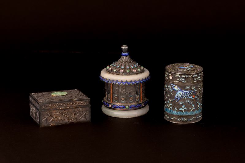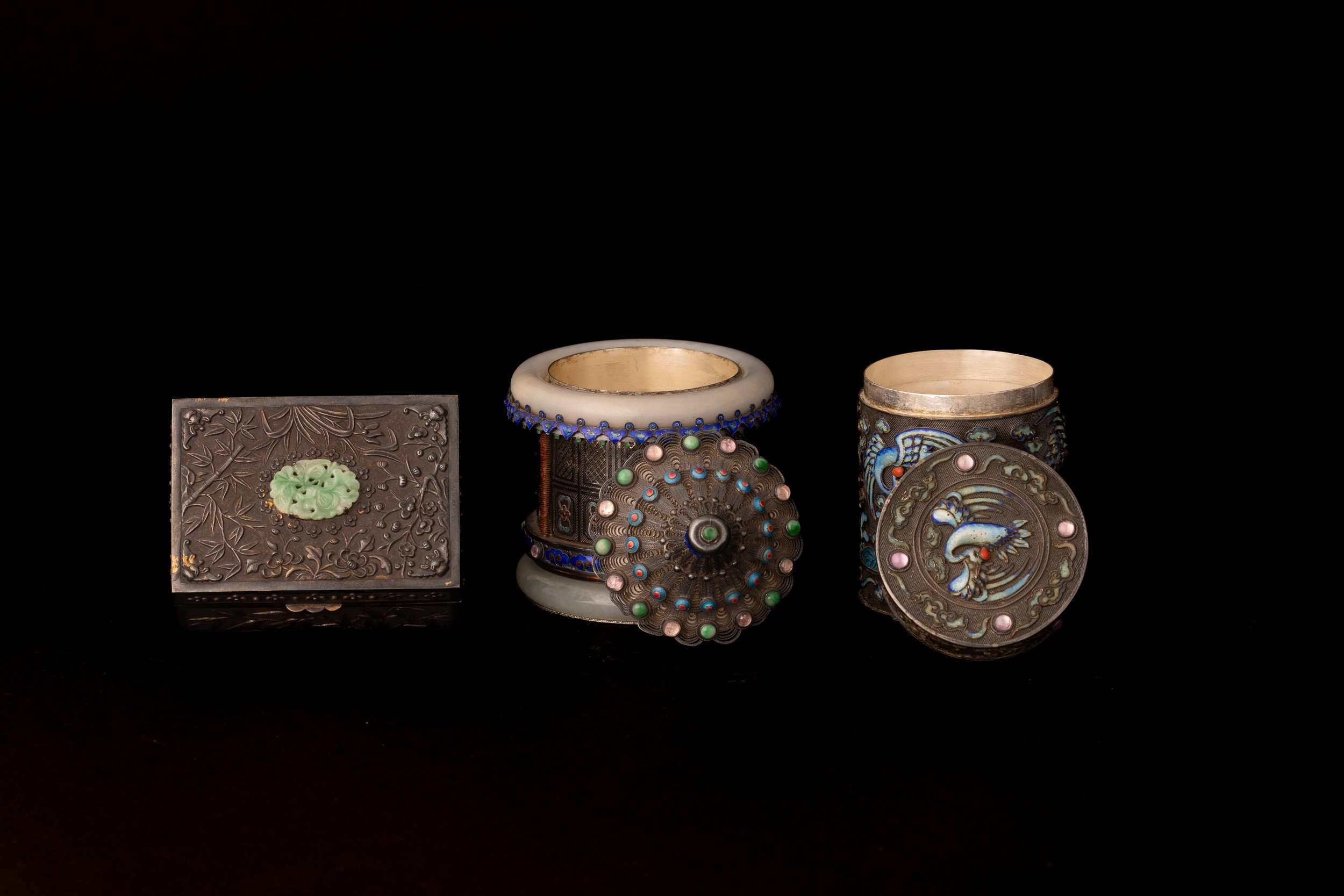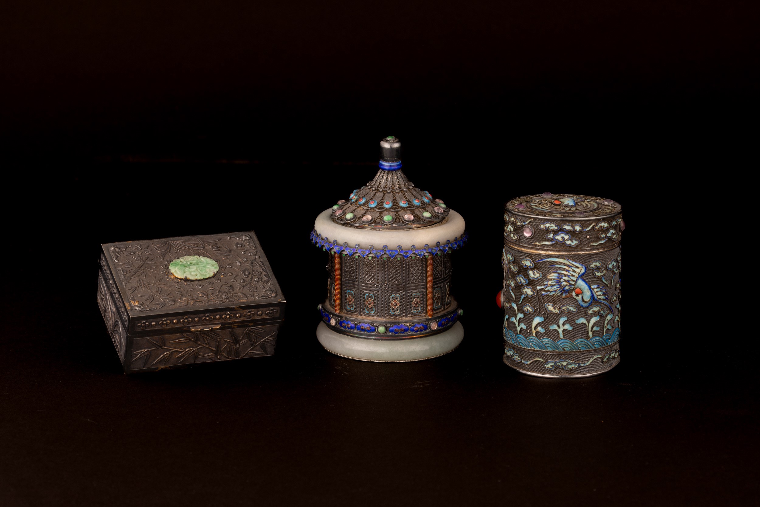 Lot consisting of three silver and enamel boxes with jade and gemstone inserts, China, early 20th century
