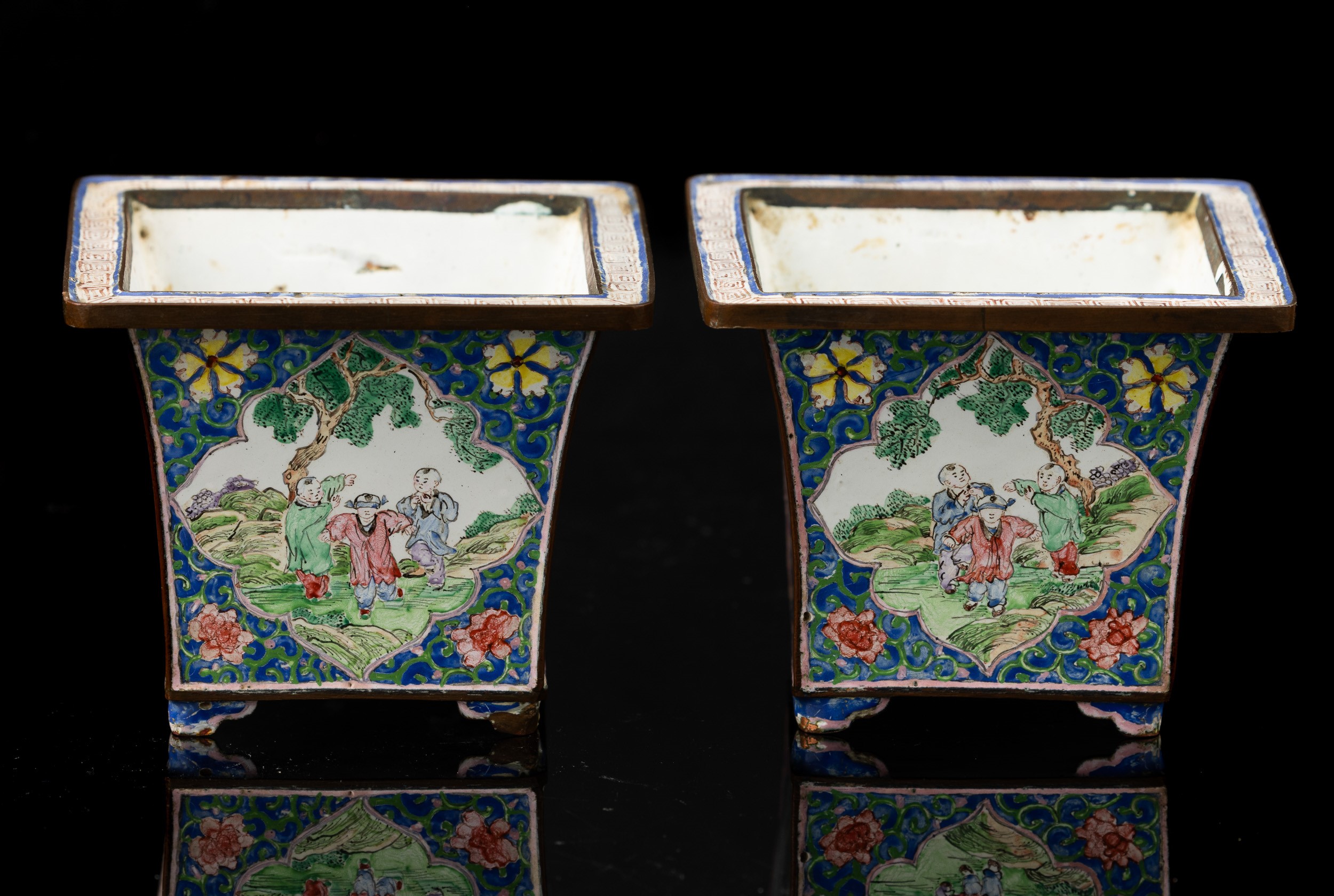 Pair of small square enamel garden boxes with figures of wise men and naturalistic subjects within shaped reserves and floral decorations, China, Republic period