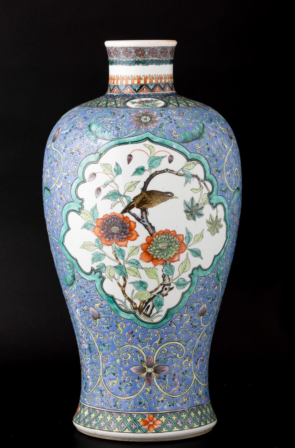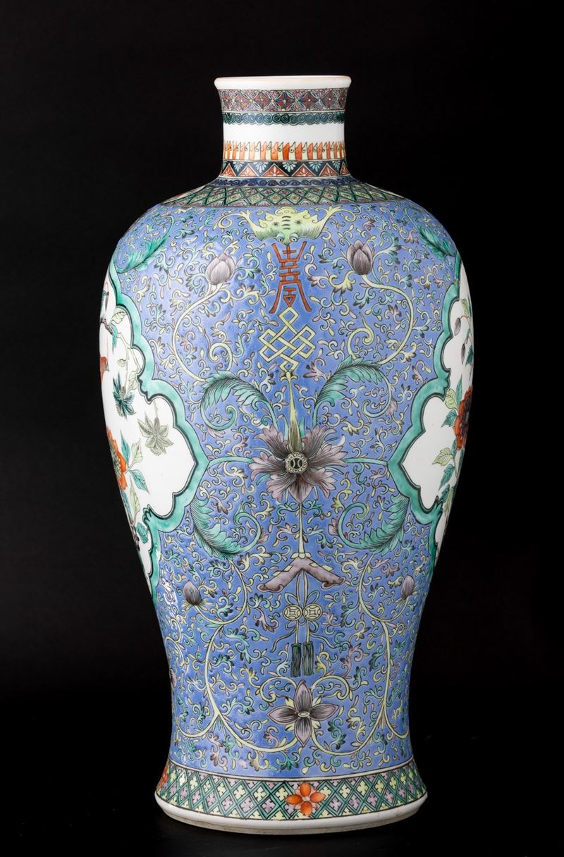 Polychrome enamel porcelain vase with naturalistic subjects within shaped reserves and floral decorations, China, Qing Dynasty, [..]