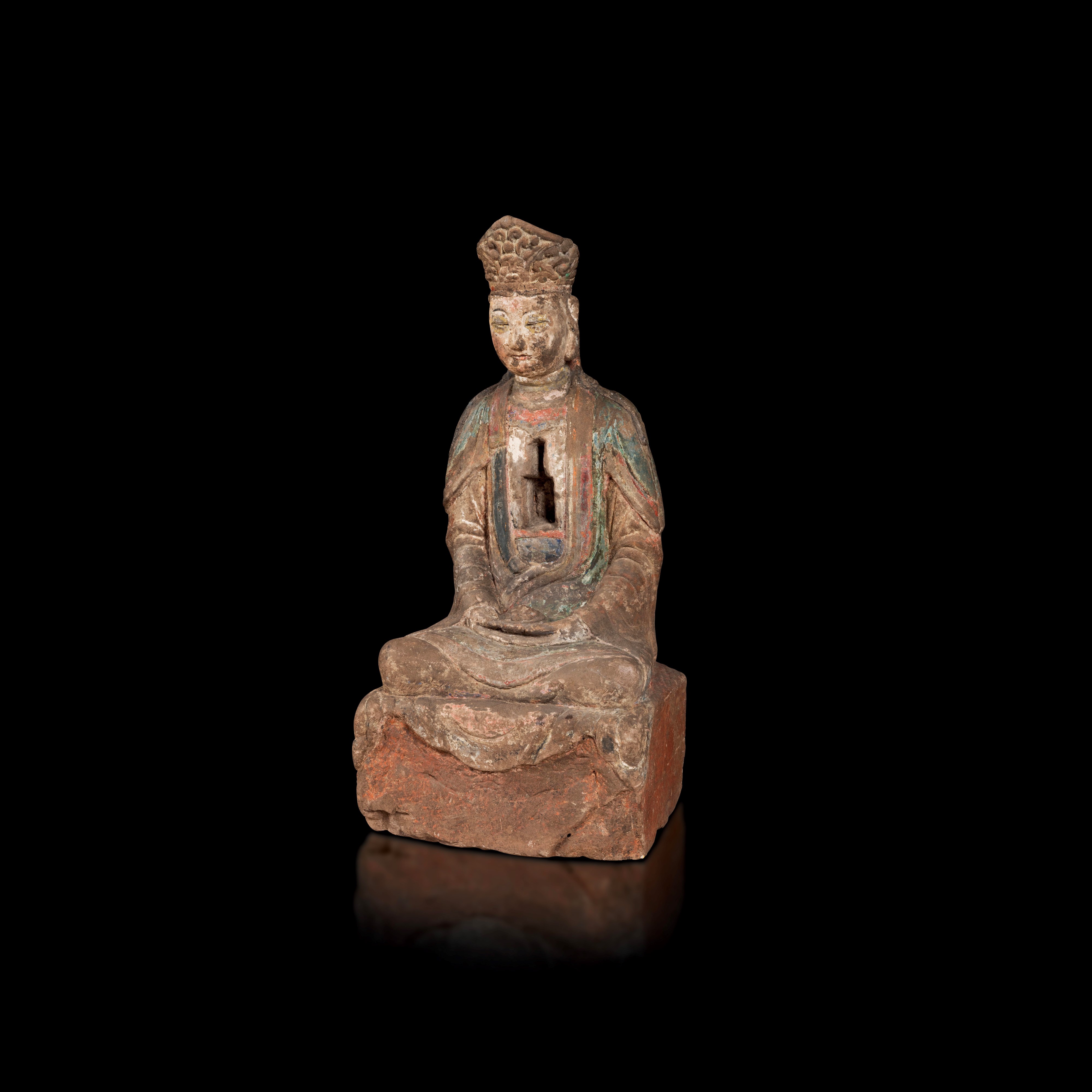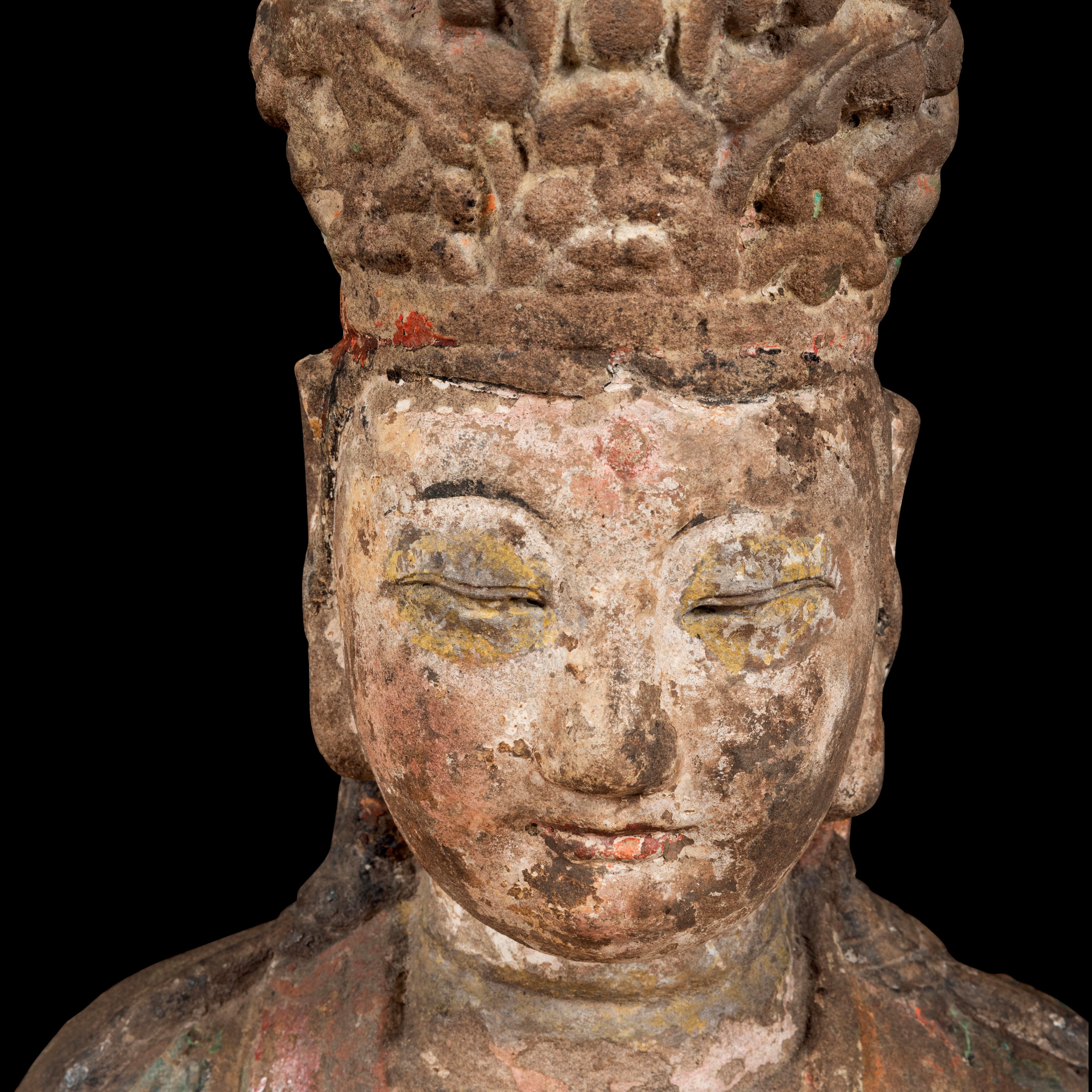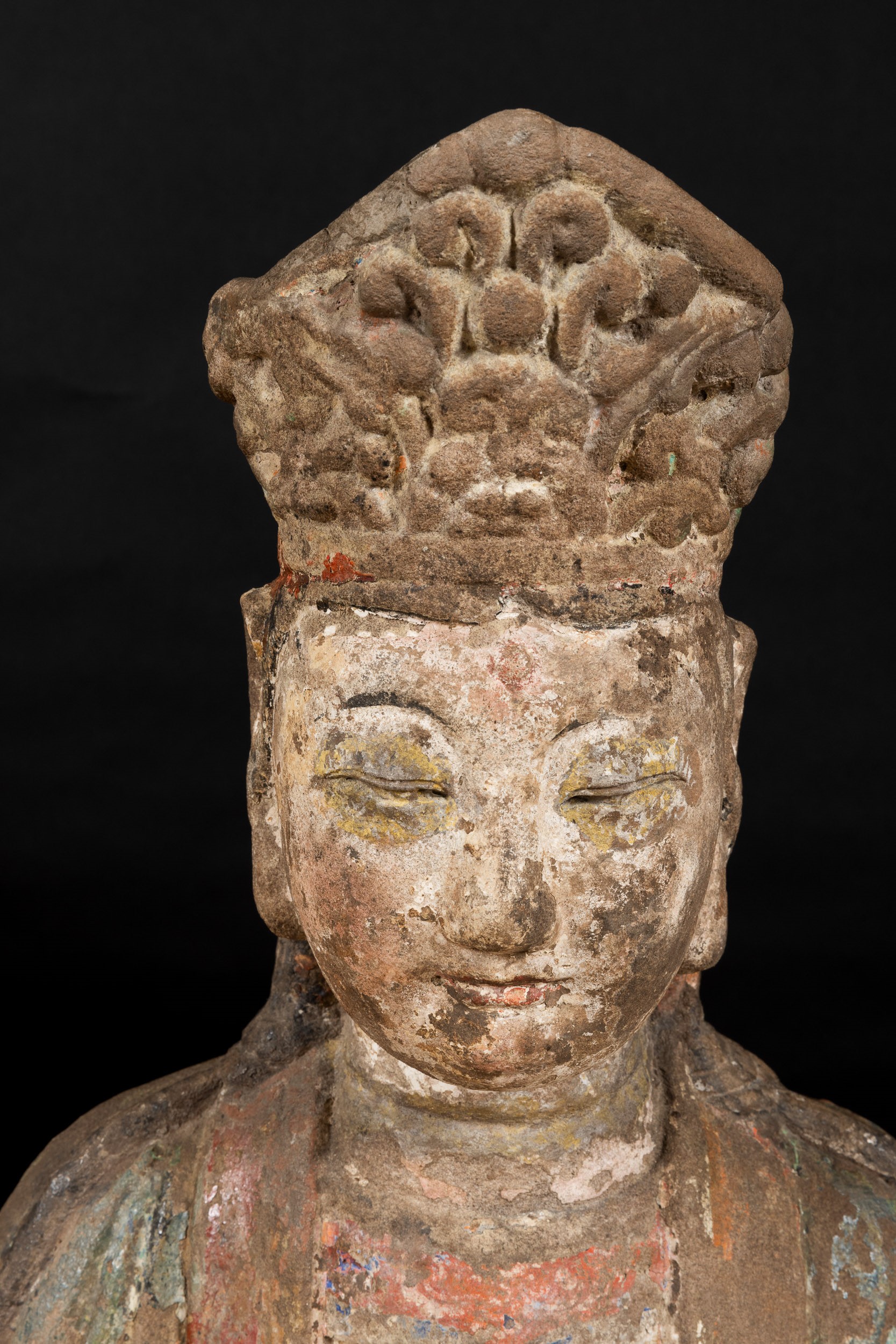 Rare and large crowned Guanyin figure seated in stone, China, Song Dynasty, 10th-13th century