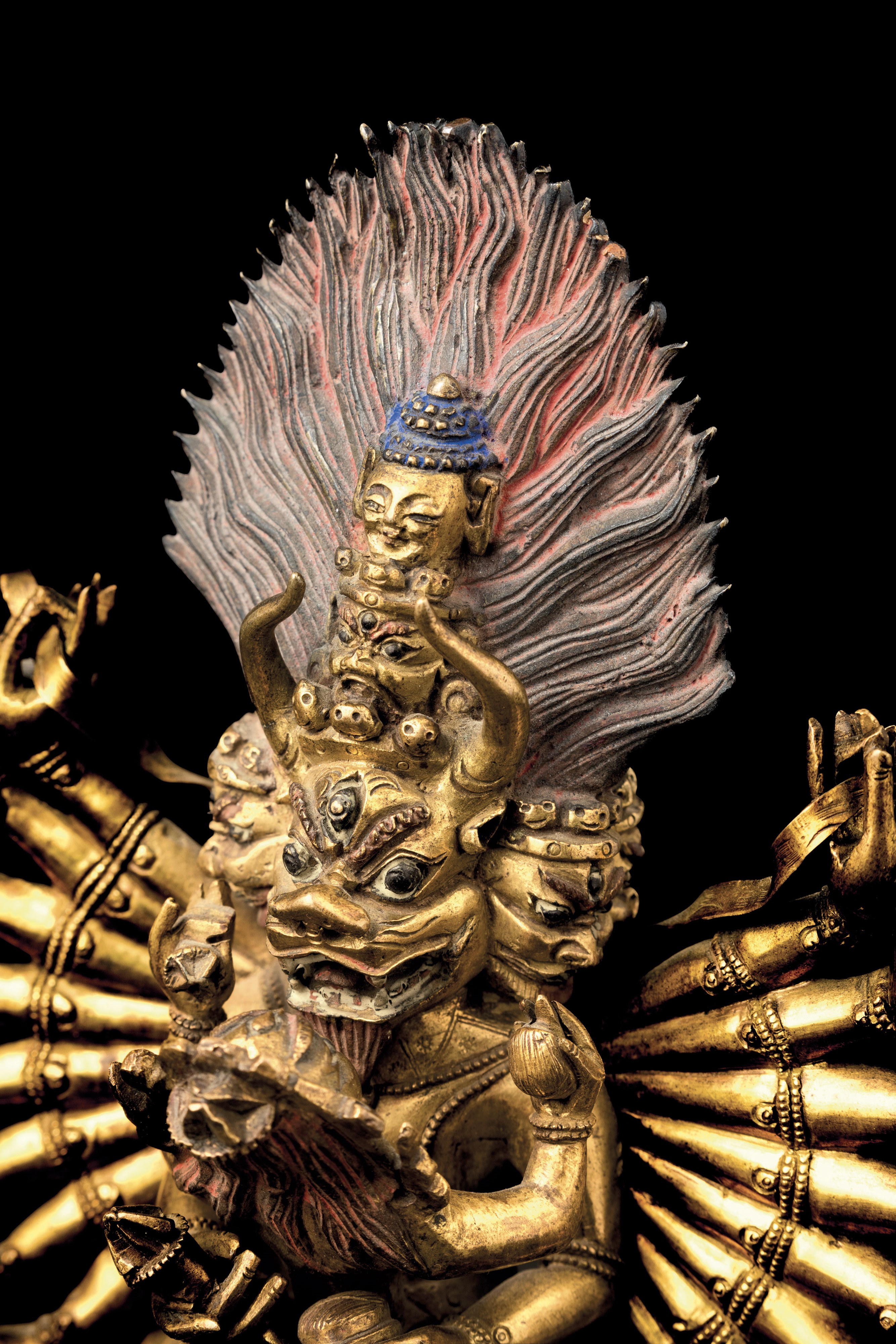 五大明王之一,是藏传佛教尊奉的主要本尊之一。 此尊分体铸造,通体鎏金,大威德为九头三十四臂,九头分三层排列,正面为牛头,牛角粗大,血盆大口,头戴五骷髅冠;最上一头,为文殊菩萨头像,表示大威德金刚是文殊菩萨的化身。头顶红发上竖,象征忿怒。上身饰璎珞,佩饰宝璐,双臂、腕踝均戴钏镯。