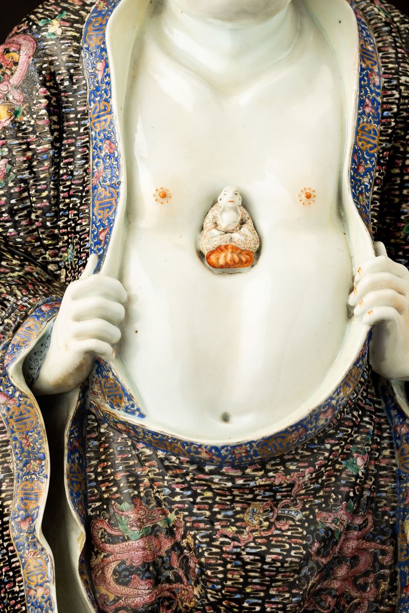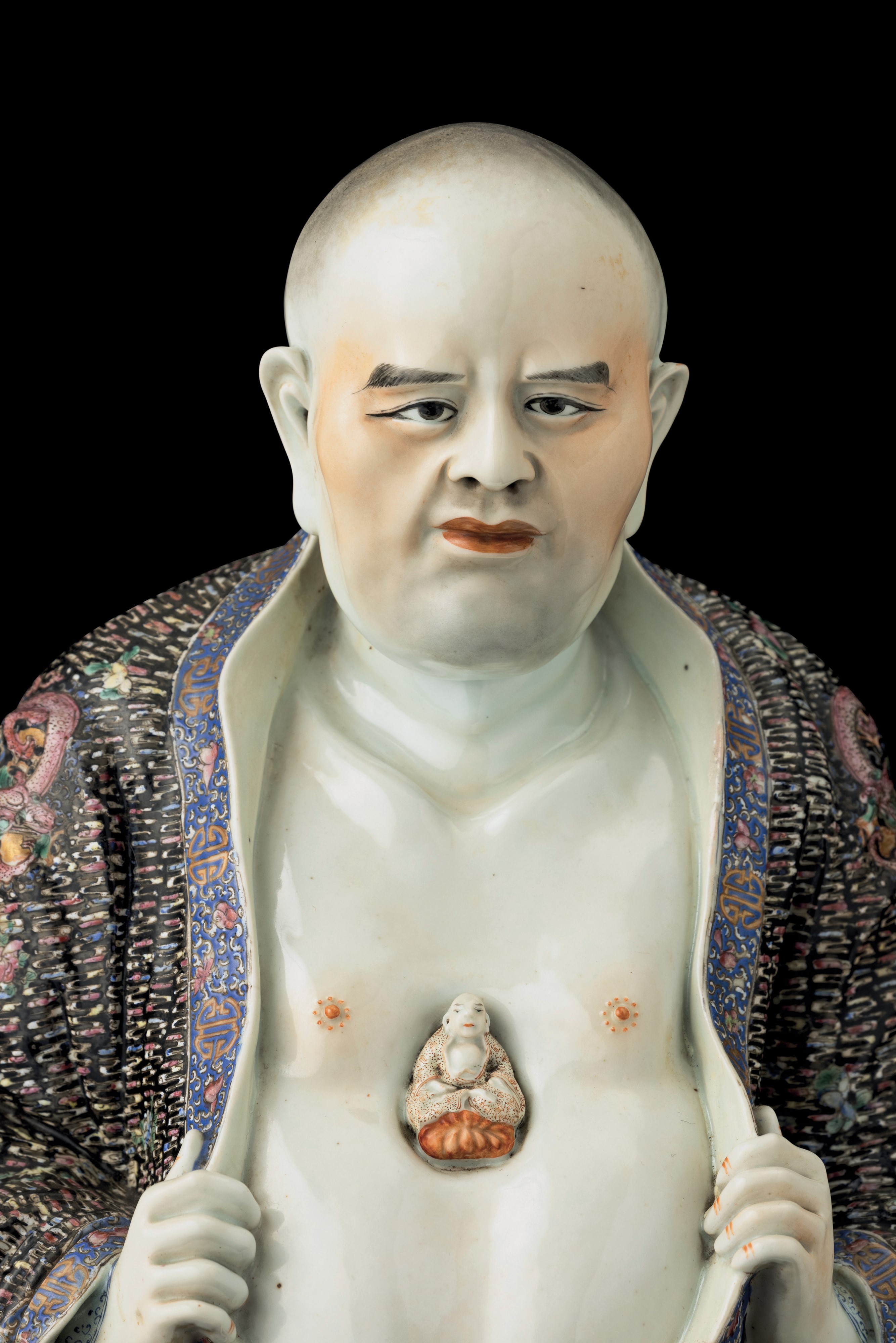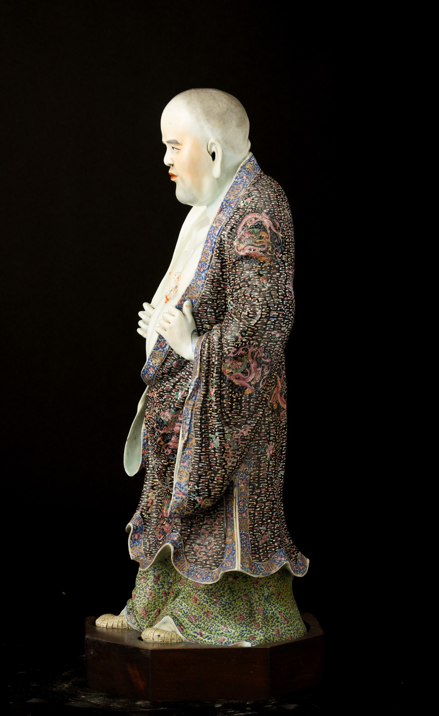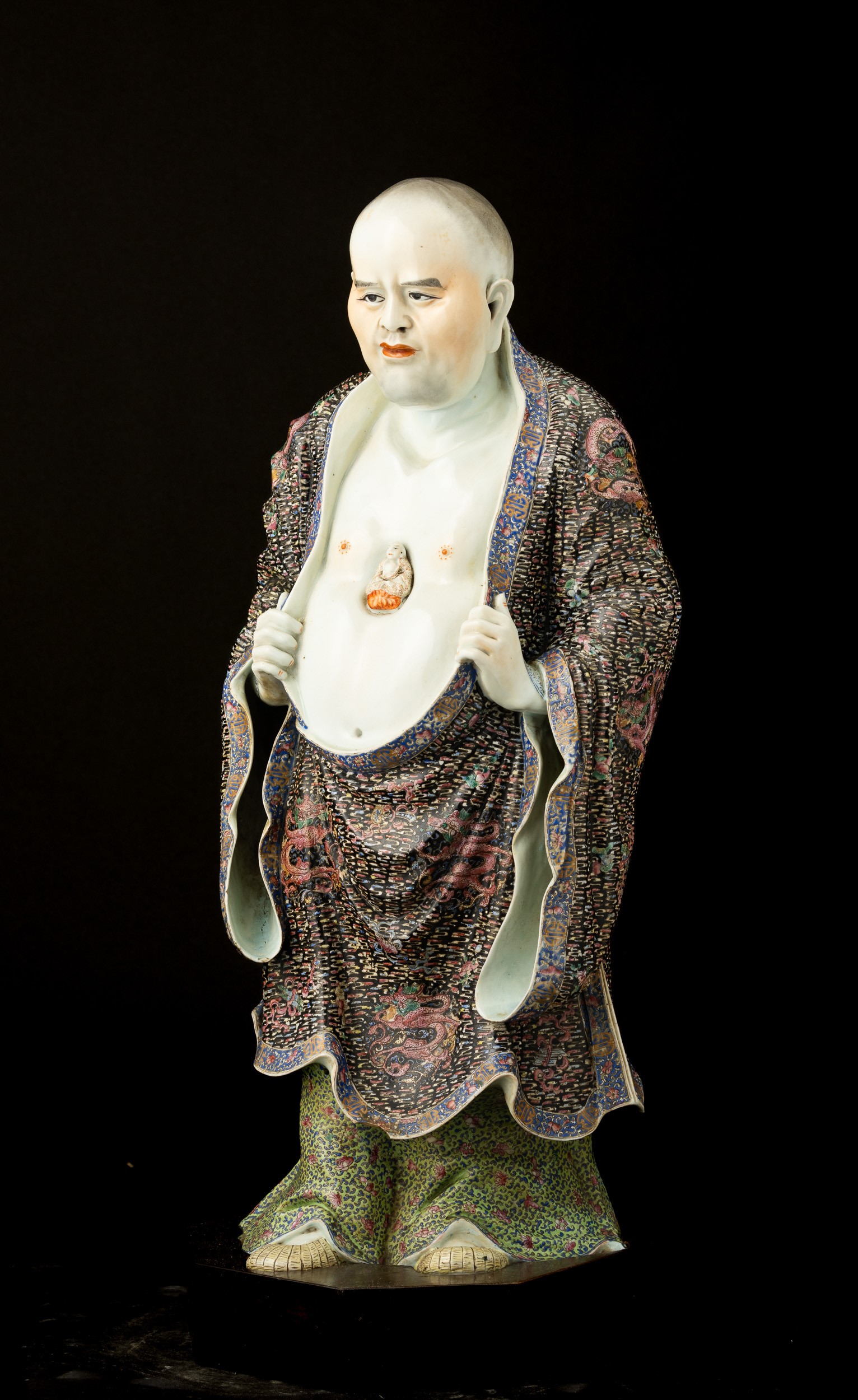 Rare figure of Sage, Famille Rose, standing in polychrome porcelain with relief Buddha in the center of the chest, decorated with dragons in the clouds, China, Qing Dynasty, Guangxu era (1875-1908)